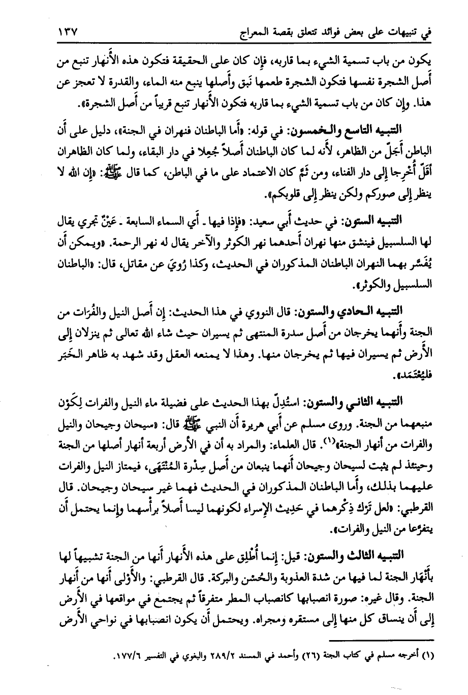 قال العلماء: والمراد به أن في الأرض أربعة أنهار أصلها من الجنة وحينئذ لم يثبت لسيحان وجيحان أنهما ينبعان من أصل سدرة المنتهى، فيمتاز النيل والفرات عليهما بذلك، وأما الباطنان المذكوران في الحديث فهما غير سيحان وجيحان. قال القرطبي: «لعل ترك ذكرهما في حديث الإسراء لكونهما ليسا أصلا برأسهما وإنما يحتمل أن يتفرّعا من النيل والفرات» .