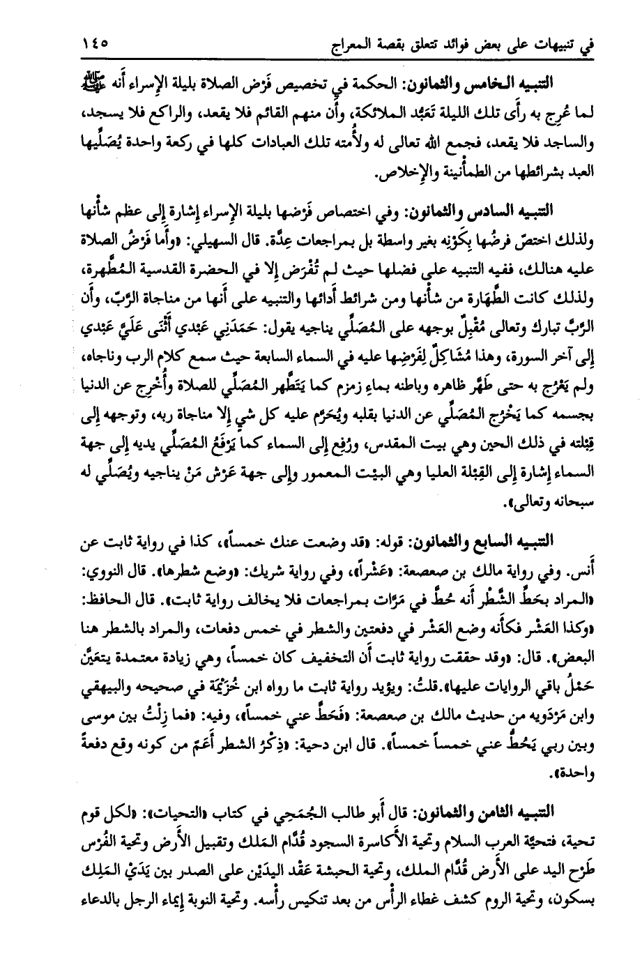 وفي اختصاص فرضها بليلة الإسراء إشارة إلى عظم شأنها ولذلك اختصّ فرضها بكونه بغير واسطة بل بمراجعات عدّة. قال السهيلي: «وأما فرض الصلاة عليه هنالك، ففيه التنبيه على فضلها حيث لم تفرض إلا في الحضرة القدسية المطّهرة، ولذلك كانت الطّهارة من شأنها ومن شرائط أدائها والتنبيه على أنها من مناجاة الرّبّ، وأن الرب تبارك وتعالى مقبل بوجهه على المصلّي يناجيه يقول: حمدني عبدي أثنى عليّ عبدي إلى آخر السورة، وهذا مشاكل لفرضها عليه في السماء السابعة حيث سمع كلام الرب وناجاه، ولم يعرج به حتى طهّر ظاهره وباطنه بماء زمزم كما يتطّهر المصلّي للصلاة وأخرج عن الدنيا بجسمه كما يخرج المصلّي عن الدنيا بقلبه ويحرّم عليه كل شي إلا مناجاة ربه، وتوجهه إلى قبلته في ذلك الحين وهي بيت المقدس، ورفع إلى السماء كما يرفع المصلّي يديه إلى جهة السماء إشارة إلى القبلة العليا وهي البيت المعمور وإلى جهة عرش من يناجيه ويصلّي له سبحانه وتعالى» .