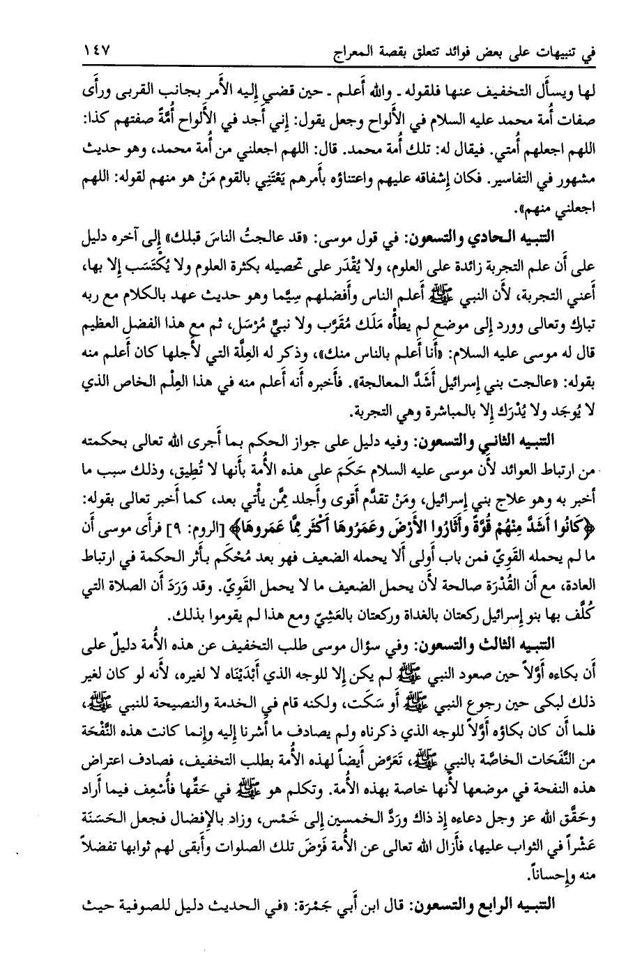 وفي سؤال موسى طلب التخفيف عن هذه الأمة دليل على أن بكاءه أوّلا حين صعود النبي صلى الله عليه وسلم لم يكن إلا للوجه الذي أبديناه لا لغيره، لأنه لو كان لغير ذلك لبكى حين رجوع النبي صلى الله عليه وسلم أو سكت، ولكنه قام في الخدمة والنصيحة للنبي صلى الله عليه وسلم، فلما أن كان بكاؤه أوّلا للوجه الذي ذكرناه ولم يصادف ما أشرنا إليه وإنما كانت هذه النّفحة من النّفحات الخاصّة بالنبي صلى الله عليه وسلم، تعرّض أيضا لهذه الأمة بطلب التخفيف، فصادف اعتراض هذه النفحة في موضعها لأنها خاصة بهذه الأمة. وتكلم هو صلى الله عليه وسلم في حقّها فأشعف فيما أراد وحقّق الله عز وجل دعاءه إذ ذاك وردّ الخمسين إلى خمس، وزاد بالإفضال فجعل الحسنة عشرا في الثواب عليها، فأزال الله تعالى عن الأمة فرض تلك الصلوات وأبقى لهم ثوابها تفضلا منه وإحسانا.