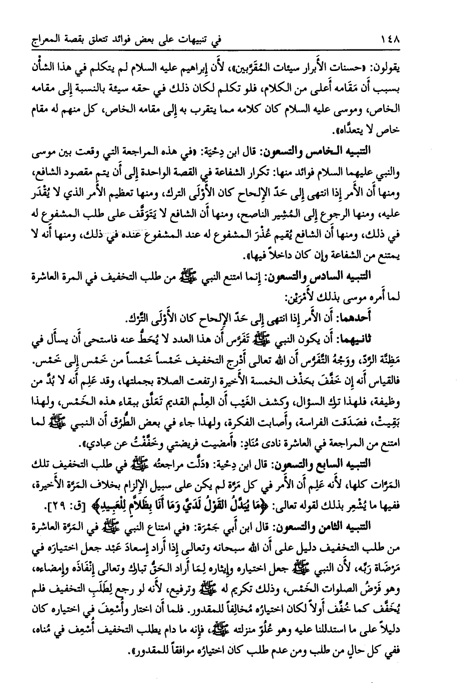 فالقياس أنه إن خفّف بحذف الخمسة الأخيرة ارتفعت الصلاة بجملتها، وقد علم إنه لا بد من وظيفة، فلهذا ترك السؤال، وكشف الغيب أن العلم القديم تعلّق ببقاء هذه الخمس، ولهذا بقيت، فصدقت الفراسة، وأصابت الفكرة، ولهذا جاء في بعض الطرق أن النبي صلى الله عليه وسلم لما امتنع من المراجعة في العاشرة نادى مناد: «أمضيت فريضتي وخفّفت عن عبادي» .
