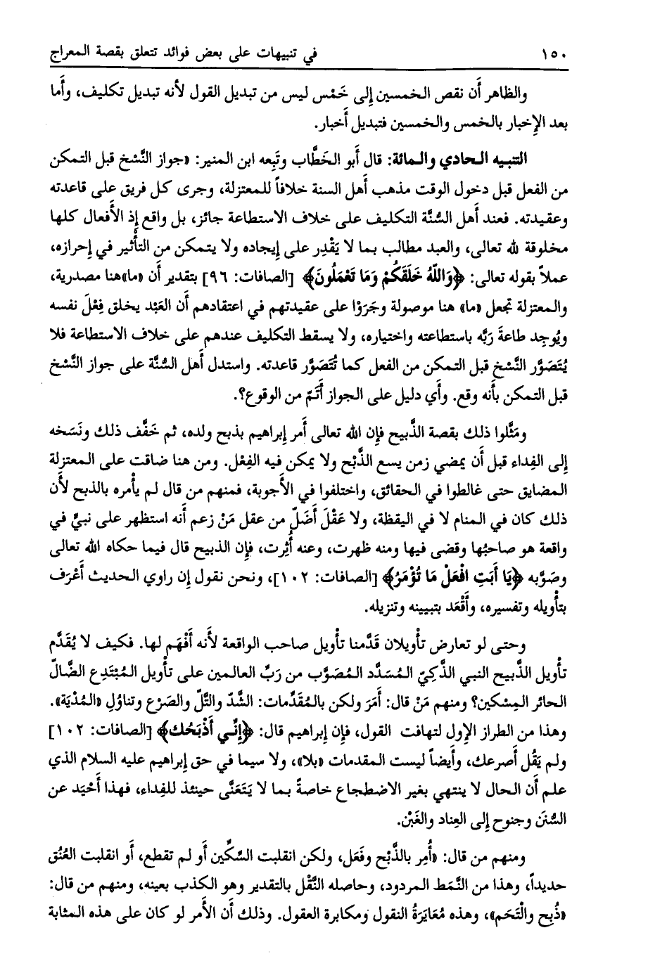 ومثّلوا ذلك بقصة الذّبيح فإن الله تعالى أمر إبراهيم بذبح ولده، ثم خفّف ذلك ونسخه إلى الفداء قبل أن يمضي زمن يسع الذّبح ولا يمكن فيه الفعل. ومن هنا ضاقت على المعتزلة المضايق حتى غالطوا في الحقائق، واختلفوا في الأجوبة، فمنهم من قال لم يأمره بالذبح لأن ذلك كان في المنام لا في اليقظة، ولا عقل أضلّ من عقل من زعم أنه استظهر على نبيّ في واقعة هو صاحبها وقضى فيها ومنه ظهرت، وعنه أثرت، فإن الذبيح قال فيما حكاه الله تعالى وصوّبه يا أَبَتِ افْعَلْ ما تُؤْمَرُ [الصافات: 102] ، ونحن نقول إن راوي الحديث أعرف بتأويله وتفسيره، وأقعد بتبيينه وتنزيله.