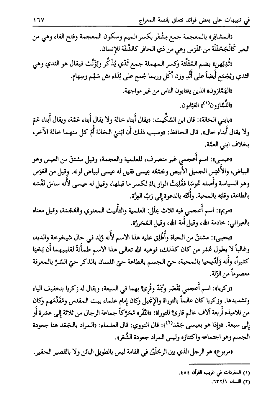 «زكريا» : اسم أعجمي يقصر ويمدّ وقرئ بهما في السبعة، ويقال له زكريا بتخفيف الياء وتشديدها. وزكريا كان عالما بالتوراة والإنجيل وكان إمام علماء بيت المقدس ومقدّمهم وكان من تلاميذه أربعة آلاف عالم قارئ للتوراة: «النّقر» محرّكا جماعة الرجال من ثلاثة إلى عشرة أو إلى سبعة. «وإذا هو بعيسى جعد [ (2) ] » : قال النووي: قال العلماء: «المراد بالجعد هنا جعودة الجسم وهو اجتماعه واكتنازه وليس المراد جعودة الشّعر» .