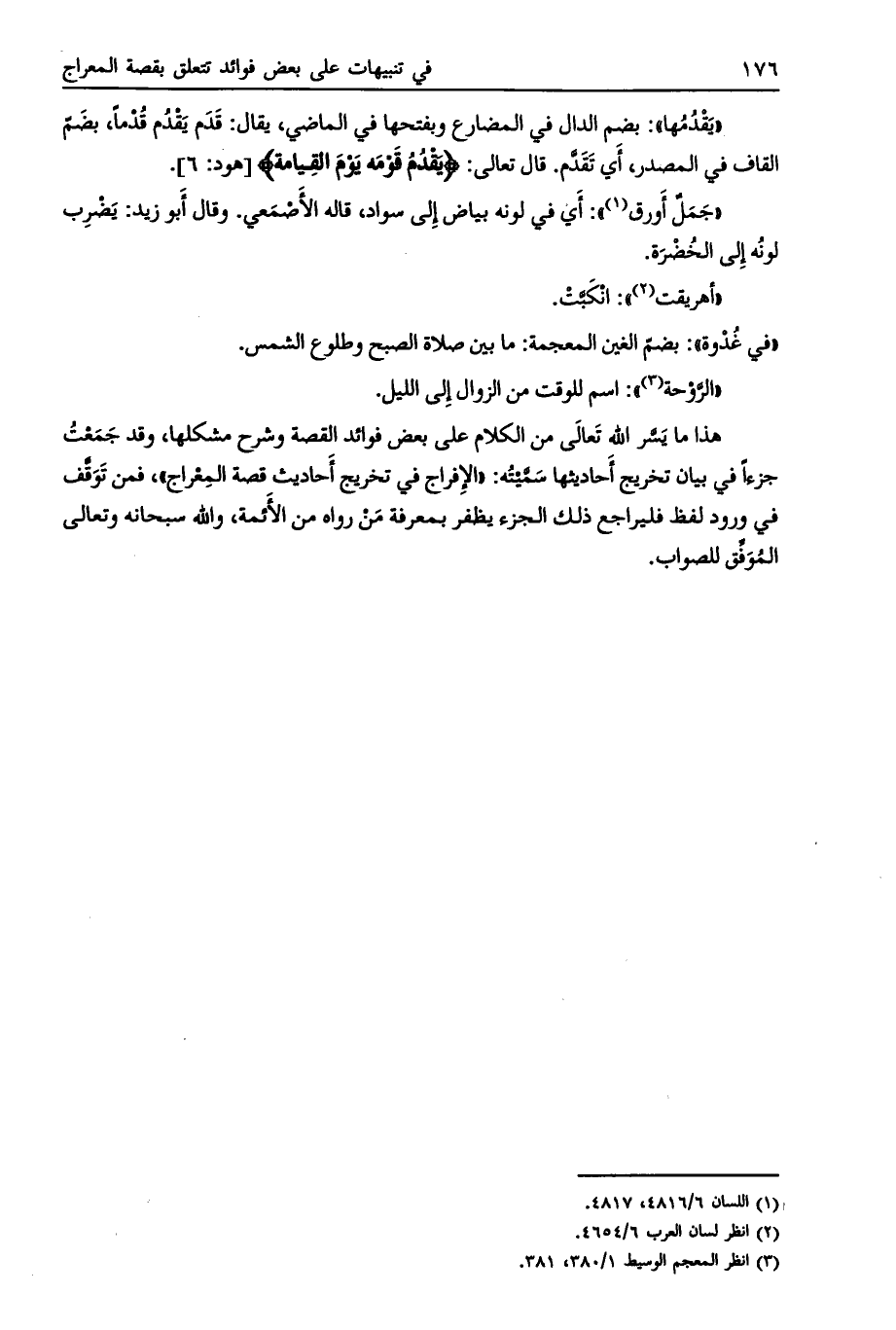 هذا ما يسرّ الله تعالى من الكلام على بعض فوائد القصة وشرح مشكلها، وقد جمعت جزءا في بيان تخريج أحاديثها سمّيته: «الإفراج في تخريج أحاديث قصة المعراج» ، فمن توقّف في ورد لفظ فليراجع ذلك الجزء يظفر بمعرفة من رواه من الأئمة، والله سبحانه وتعالى الموفّق للصواب.