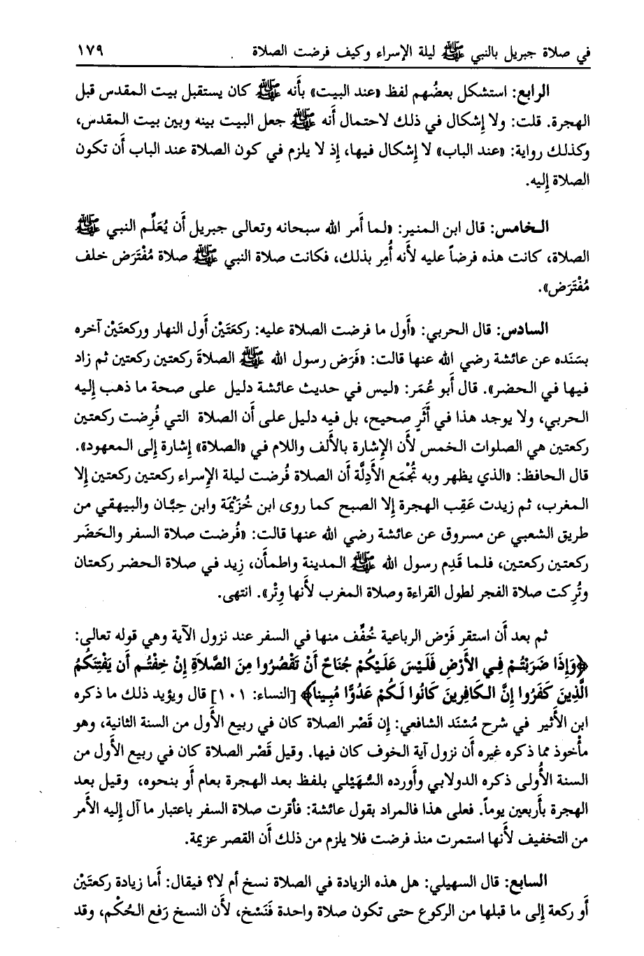 قال الحافظ: «الذي يظهر وبه تجمع الأدلّة أن الصلاة فرضت ليلة الإسراء ركعتين ركعتين إلا المغرب، ثم زيدت عقب الهجرة إلا الصبح كما روى ابن خزيمة وابن حبّان والبيهقي من طريق الشعبي عن مسروق عن عائشة رضي الله عنها قالت: «فرضت صلاة السفر والحضر ركعتين ركعتين، فلما قدم رسول الله صلى الله عليه وسلم المدينة واطمأن، زيد في صلاة الحضر ركعتان وتركت صلاة الفجر لطول القراءة وصلاة المغرب لأنها وتر» . انتهى.
