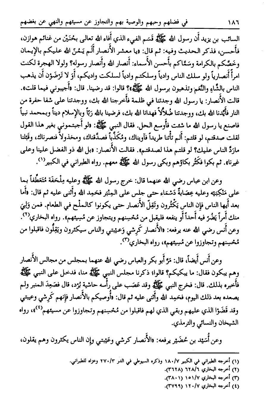 وعن أنس رضي الله عنه يرفعه: «الأنصار كرشي وعيبتي والناس سيكثرون ويقلّون فأقبلوا من محسنهم وتجاوزوا عن مسيئهم» ، رواه البخاري
