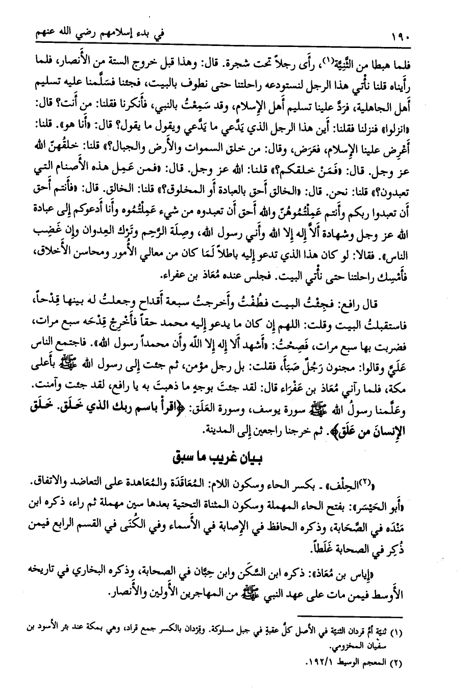 أعرض علينا الإسلام، فعرض، وقال: من خلق السموات والأرض والجبال؟» قلنا: خلقهنّ الله عز وجل. قال: «فمن خلقكم؟» قلنا: الله عز وجل. قال: «فمن عمل هذه الأصنام التي تعبدون؟» قلنا: نحن. قال: «الخالق أحق بالعبادة أو المخلوق؟» قلنا: قال: «فأنتم أحق أن تعبدوا ربكم وأنتم عملتموهنّ والله أحق أن تعبدوه من شيء عملتموه وأنا أدعوكم إلى عبادة الله عز وجل وشهادة ألّا إله إلا الله، وأني رسول الله، وصلة الرّحم وترك العدوان وإن غضب الناس» . فقالا: لو كان هذا الذي تدعو إليه باطلا لما كان من معالي الأمور ومحاسن الأخلاق، فأمسك راحلتنا حتى نأتي البيت. فجلس عنده معاذ بن عفراء.