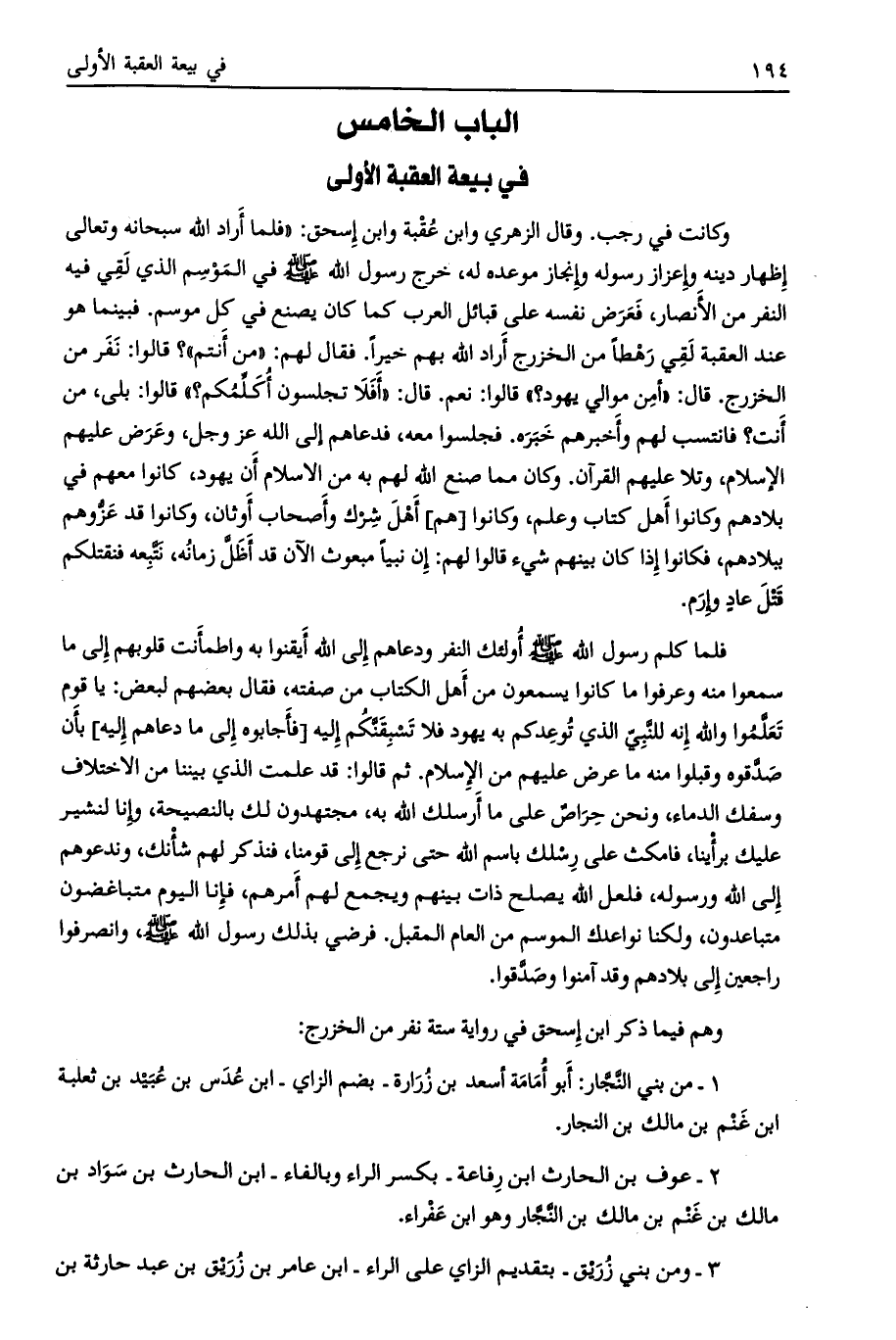 وقال الزهري وابن عقبة وابن إسحق: «فلما أراد الله سبحانه وتعالى إظهار دينه وإعزاز رسوله وإنجاز موعده له، خرج رسول الله صلى الله عليه وسلم في الموسم الذي لقي فيه النفر من الأنصار، فعرض نفسه على قبائل العرب كما كان يصنع في كل موسم. فبينما هو عند العقبة لقي رهطا من الخزرج أراد الله بهم خيرا. فقال لهم: «من أنتم» ؟ قالوا: نفر من الخزرج. قال: «أمن موالي يهود؟» قالوا: نعم. قال: «أفلا تجلسون أكلّمكم؟» قالوا: بلى، من أنت؟ فانتسب لهم وأخبرهم خبره. فجلسوا معه، فدعاهم إلى الله عز وجل، وعرض عليهم الإسلام، وتلا عليهم القرآن. وكان مما صنع الله لهم به من الإسلام أن يهود، كانوا معهم في ببلادهم،