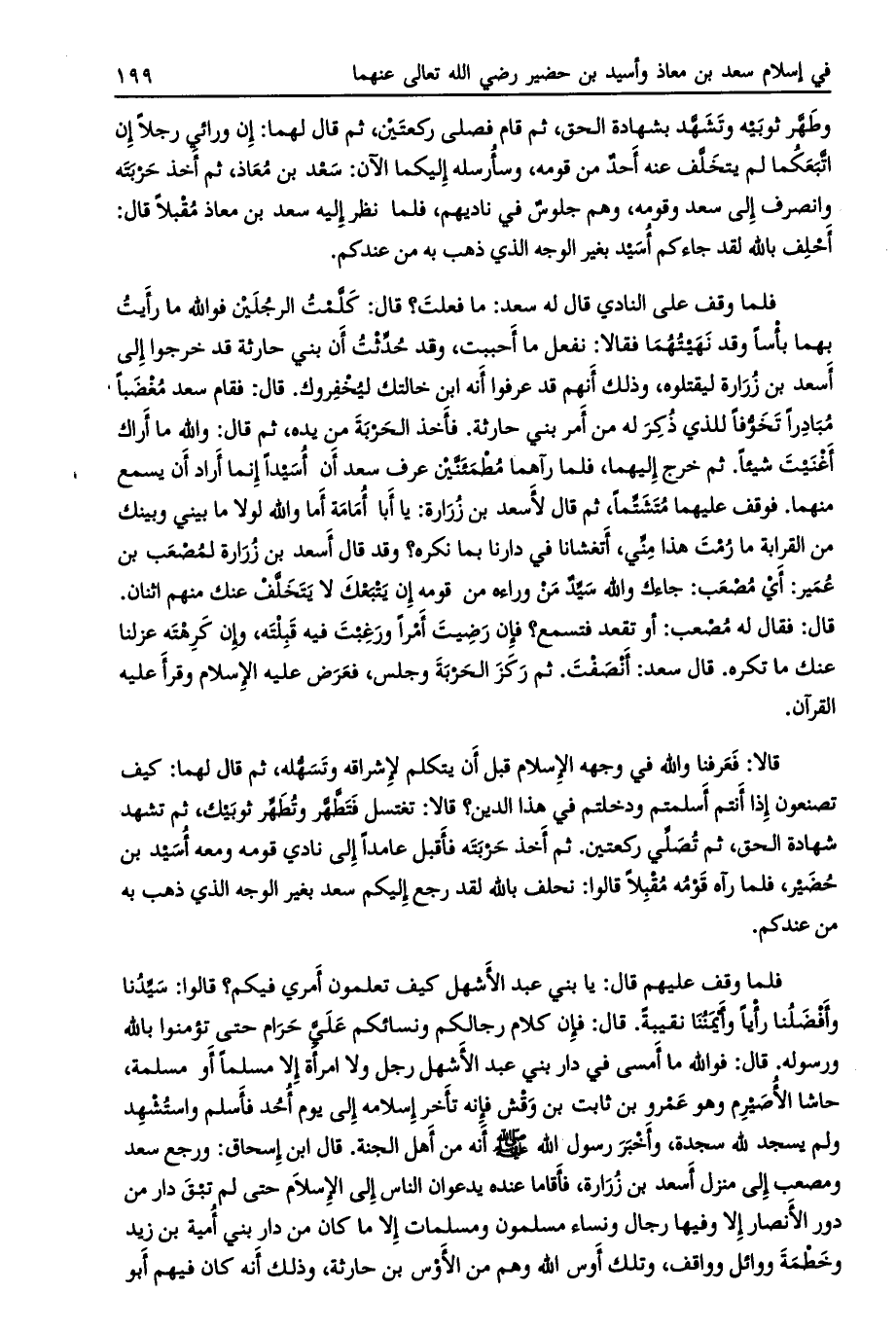 قالا: فعرفنا والله في وجهه الإسلام قبل أن يتكلم لإشراقه وتسهّله، ثم قال لهما: كيف تصنعون إذا أنتم أسلمتم ودخلتم في هذا الدين؟ قالا: تغتسل فتطّهّر وتطهّر ثوبيك، ثم تشهد شهادة الحق، ثم تصلّي ركعتين. ثم أخذ حربته فأقبل عامدا إلى نادي قومه ومعه أسيد بن حضير، فلما رآه قومه مقبلا قالوا: نحلف بالله لقد رجع إليكم سعد بغير الوجه الذي ذهب به من عندكم.