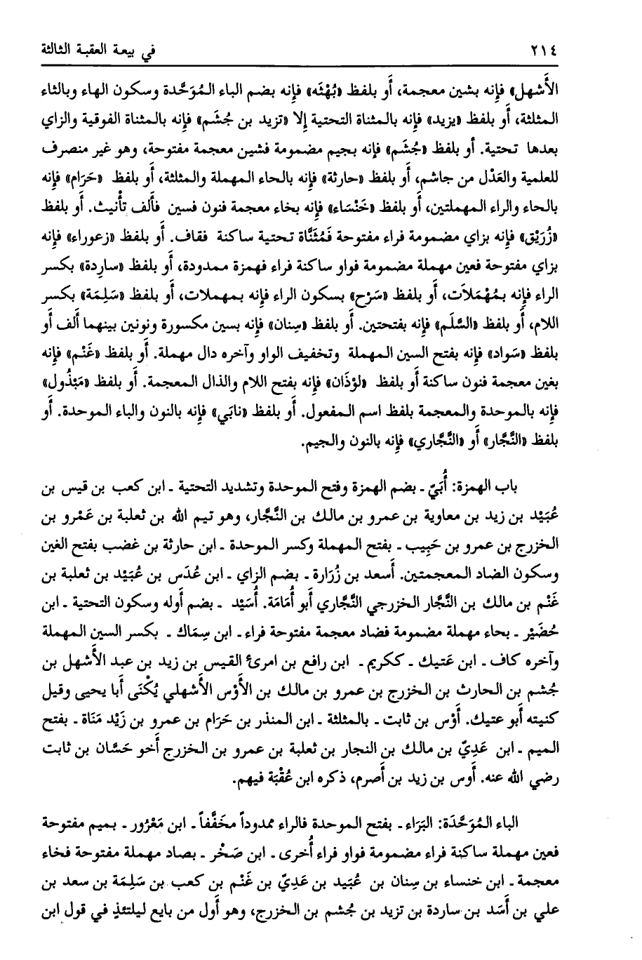 الأشهل» فإنه بشين معجمة، أو بلفظ «بهثه» فإنه بضم الباء الموحدة وسكون الهاء وبالثاء المثلثة، أو بلفظ «يزيد» فإنه بالمثناة التحتية إلا «تزيد بن جشم» فإنه بالمثناة الفوقية والزاي بعدها تحتية. أو بلفظ «جشم» فإنه بجيم مضمومة فشين معجمة مفتوحة، وهو غير منصرف للعلمية والعدل من جاشم، أو بلفظ «حارثة» فإنه بالحاء المهملة والمثلثة، أو بلفظ «حرام» فإنه بالحاء والراء المهملتين، أو بلفظ «خنساء» فإنه بخاء معجمة فنون فسين فألف تأنيث. أو بلفظ «زريق» فإنه بزاي مضمومة فراء مفتوحة فمثناة تحتية ساكنة فقاف. أو بلفظ «زعوراء» فإنه بزاي مفتوحة فعين مهملة مضمومة فواو ساكنة فراء فهمزة ممدودة، أو بلفظ «ساردة» بكسر الراء فإنه بمهملات، أو بلفظ «سرح» بسكون الراء فإنه بمهملات، أو بلفظ «سلمة» بكسر اللام، أو بلفظ «السّلم» فإنه بفتحتين. أو بلفظ «سنان» فإنه بسين مكسورة ونونين بينهما ألف أو بلفظ «سواد» فإنه بفتح السين المهملة وتخفيف الواو وآخره دال مهملة. أو بلفظ «غنم» فإنه بغين معجمة فنون ساكنة أو بلفظ «لوذان» فإنه بفتح اللام والذال المعجمة. أو بلفظ «مبذول» فإنه بالموحدة والمعجمة بلفظ اسم المفعول. أو بلفظ «نابي» فإنه بالنون والباء الموحدة. أو بلفظ «النّجّار» أو «النّجّاري» فإنه بالنون والجيم.