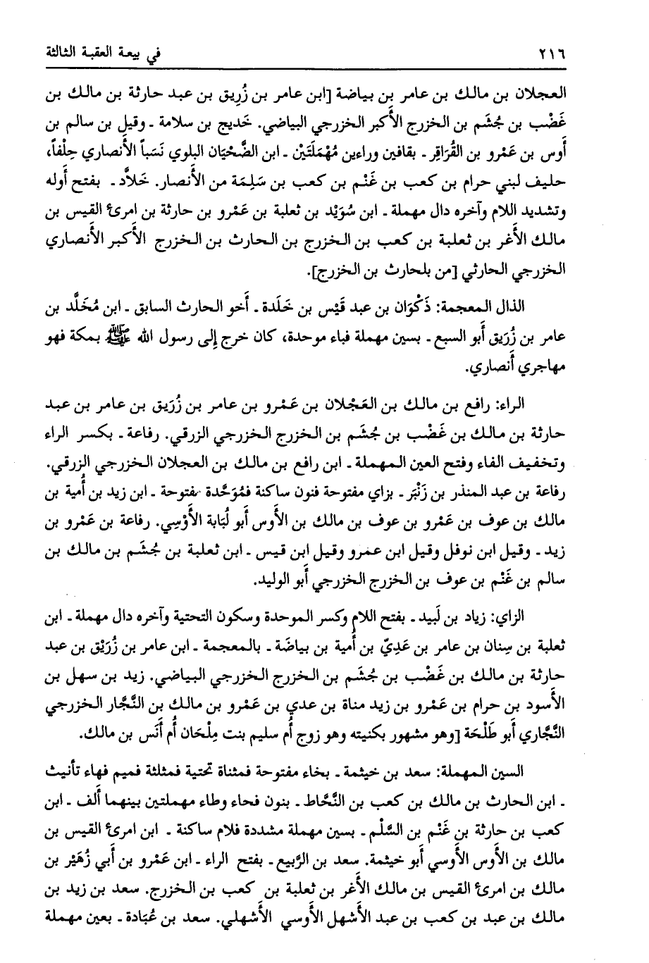 العجلان بن مالك بن عامر بن بياضة [ابن عامر بن زريق بن عبد حارثة بن مالك بن غضب بن جشم بن الخزرج الأكبر الخزرجي البياضي. خديج بن سلامة- وقيل بن سالم بن أوس بن عمرو بن القراقر- بقافين وراءين مهملتين- ابن الضّحيان البلوي نسبا الأنصاري حلفا، حليف لبني حرام بن كعب بن غنم بن كعب بن سلمة من الأنصار. خلّاد- بفتح أوله وتشديد اللام وآخره دال مهملة- ابن سويد بن ثعلبة بن عمرو بن حارثة بن امرئ القيس بن مالك الأغر بن ثعلبة بن كعب بن الخزرج بن الحارث بن الخزرج الأكبر الأنصاري الخزرجي الحارثي [من بلحارث بن الخزرج] .
