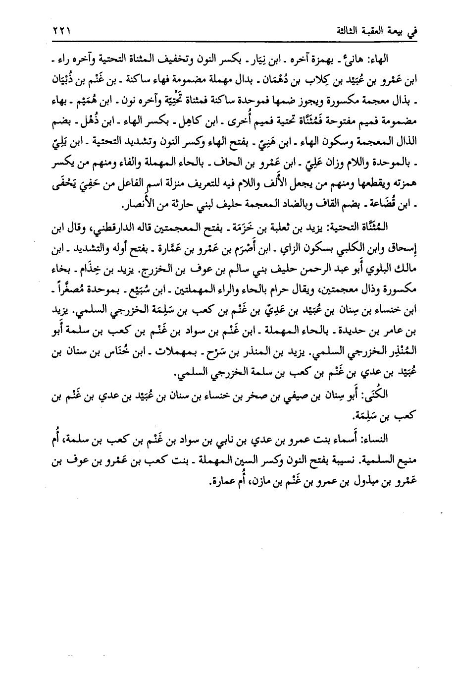 النساء: أسماء بنت عمرو بن عدي بن نابي بن سواد بن غنم بن كعب بن سلمة، أم منيع السلمية. نسيبة بفتح النون وكسر السين المهملة- بنت كعب بن عمرو بن عوف بن عمرو بن مبذول بن عمرو بن غنم بن مازن، أم عمارة.