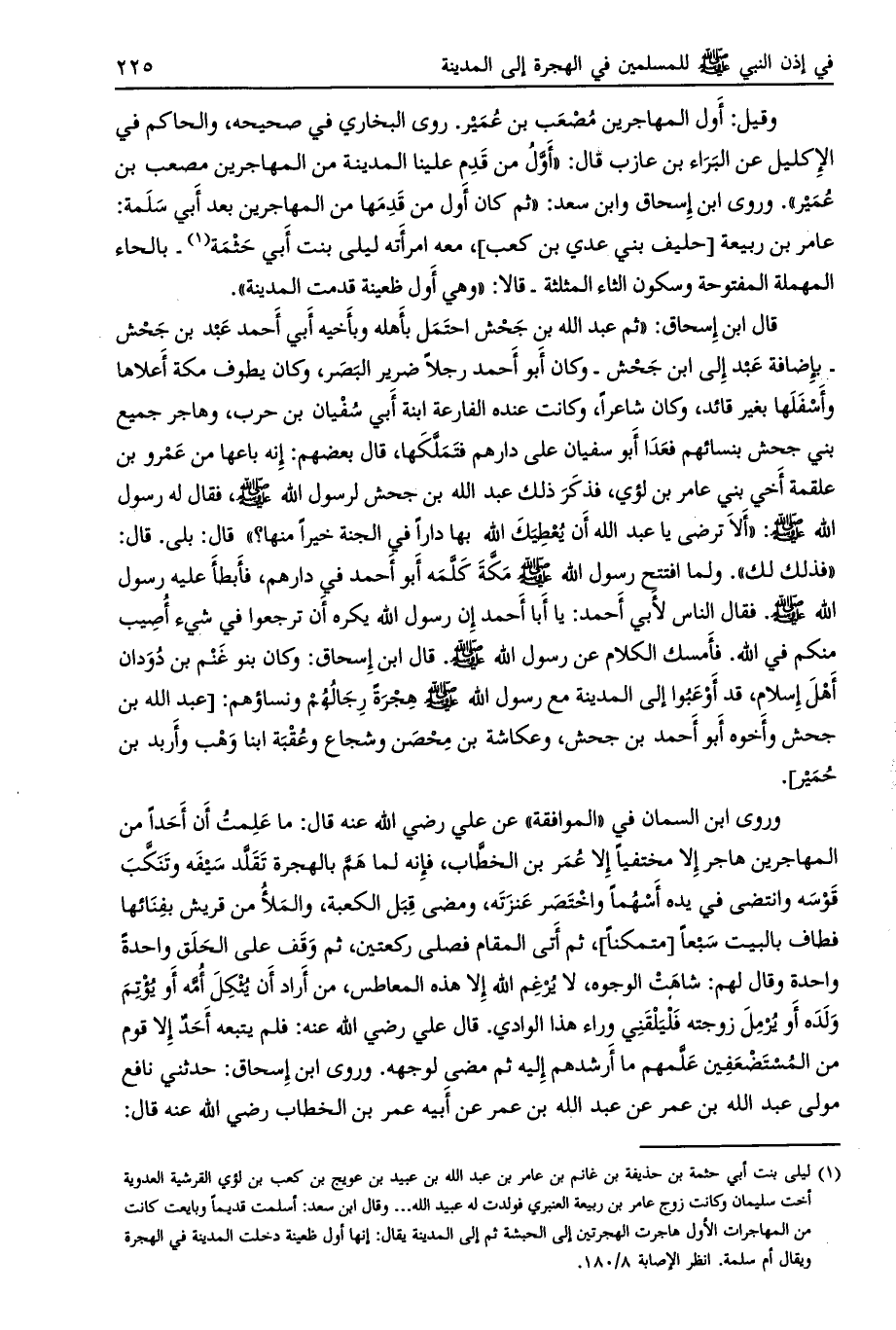 وروى ابن السمان في «الموافقة» عن علي رضي الله عنه قال: ما علمت أن أحدا من المهاجرين هاجر إلا مختفيا إلا عمر بن الخطاب، فإنه لما همّ بالهجرة تقلّد سيفه وتنكّب قوسه وانتضى في يده أسهما واختصر عنزته، ومضى قبل الكعبة، والملأ من قريش بفنائها فطاف بالبيت سبعاً [متمكنا] ، ثم أتى المقام فصلى ركعتين، ثم وقف على الحلق واحدة واحدة وقال لهم: شاهت الوجوه، لا يرغم الله إلا هذه المعاطس، من أراد أن يثكل أمّه أو يؤتم ولده أو يرمل زوجته فليلقني وراء هذا الوادي. قال علي رضي الله عنه: فلم يتبعه أحد إلا قوم من المستضعفين علّمهم ما أرشدهم إليه ثم مضى لوجهه.