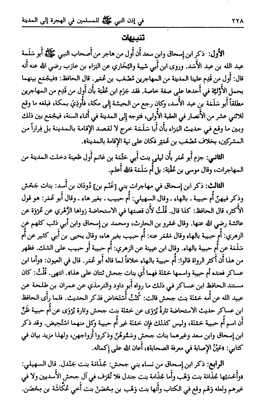 الثالث: ذكر ابن إسحاق في مهاجرات بني [غنم بن] دودان بن أسد: بنات جحش وذكر فيهنّ أم حبيبة- بالهاء- وقال السهيلي: أم حبيب- بغير هاء- وقال أبو عمر: هو قول الأكثر، قال الحافظ: كذا قال. قلت لأن قصتها في الاستحاضة رواها الزّهري عن عروة عن عائشة رضي الله عنها. وقال عمرو بن الحارث، ومحمد بن إسحاق وابن أبي ذئب كلهم عن الزهري: أم حبيبة بالهاء وقال معمر عنه: أم حبيب بغير هاء، وقال يحيى بن أبي كثير عن أم سلمة عن أم حبيبة بالهاء. وقال ابن عيينة عن الزهري: أم حبيبة أو حبيب على الشك. فظهر من هذا أن أكثر الرواة قالوا: أم حبيبة بالهاء خلافا لما قاله أبو عمر. قال في العيون: «وأما ابن عساكر فعنده أم حبيبة واسمها حمنة فهما أي بنات جحش ثنتان على هذا» . انتهى. قلت: كان مستند الحافظ ابن عساكر في ذلك ما رواه أبو داود والترمذي عن عمران بن طلحة عن عبيد الله عن أمه حمنة بنت جحش قالت: كنت أستحاض فذكر الحديث. فلما رأى الحافظ ابن عساكر حديث الاستحاضة تارة يروى عن حمنة بنت جحش وتارة يروى عن أم حبيبة ظنّ أن اسم أم حبيبة حمنة، وليس كذلك فإن حمنة غير أم حبيبة وكل منهما استحيض. وقد ذكر ابن إسحاق وابن سعد وغيرهما بنات جحش وسمّوهنّ وذكروا أزواجهن، ولهذا مزيد بيان في كتابي: «عين الإصابة في معرفة الصحابة» ، أعان الله على إكماله.