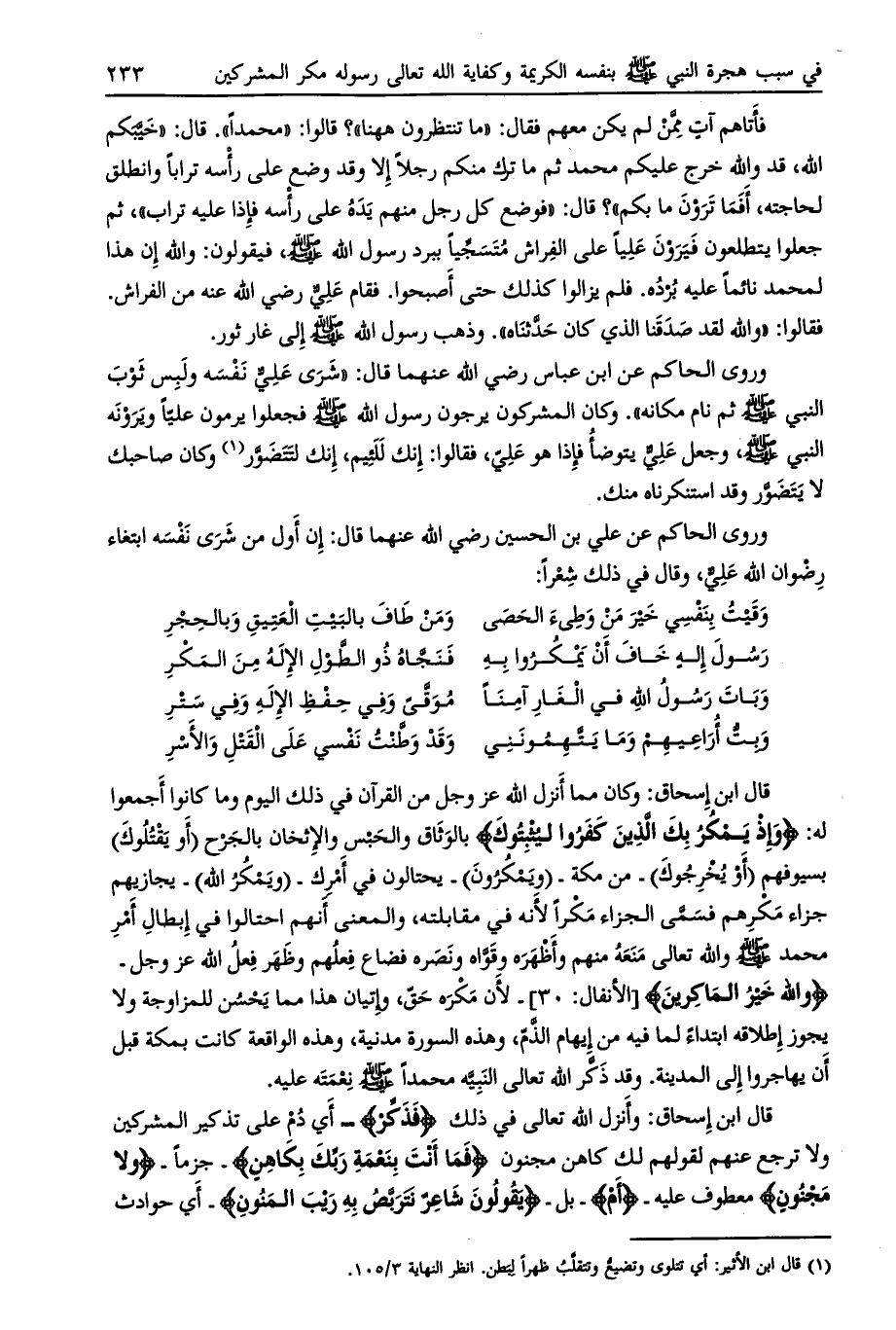 وروى الحاكم عن ابن عباس رضي الله عنهما قال: «شرى عليّ نفسه ولبس ثوب النبي صلى الله عليه وسلم ثم نام مكانه» . وكان المشركون يرجون رسول الله صلى الله عليه وسلم فجعلوا يرمون عليّا ويرونه النبي صلى الله عليه وسلم، وجعل عليّ يتوضأ فإذا هو علي، فقالوا: إنك للئيم، إنك لتتضوّر [ (1) ] وكان صاحبك لا يتضوّر وقد استنكرناه منك.