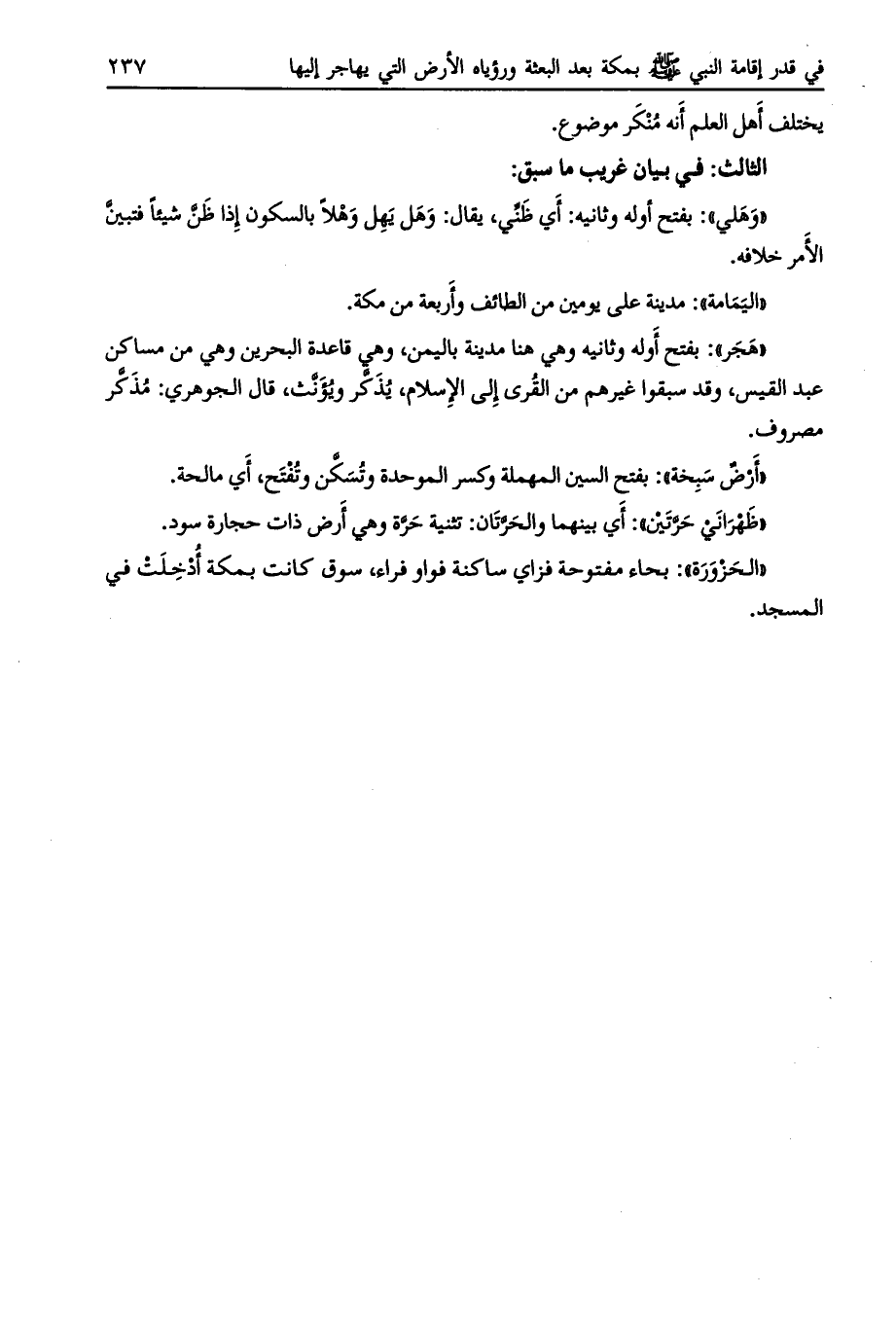 «هجر» : بفتح أوله وثانية وهي هنا مدينة باليمن، وهي قاعدة البحرين وهي من مساكن عبد القيس، وقد سبقوا غيرهم من القرى إلى الإسلام، يذكّر ويؤنّث، قال الجوهري: مذكّر مصروف.
