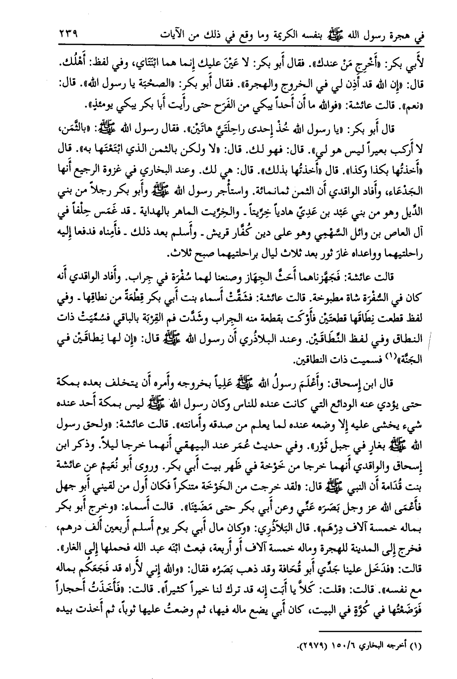قالت عائشة: فجهّزنا هما أحثّ الجهاز وصنعنا لهما سفرة في جراب. وأفاد الواقدي أنه كان في السّفرة شاة مطبوخة. قالت عائشة: فشقّت أسماء بنت أبي بكر قطعة من نطاقها- وفي لفظ قطعت نطاقها قطعتين فأوكت بقطعة منه الجراب وشدّت فم القربة بالباقي فسمّيت ذات النطاق وفي لفظ النّطاقين.