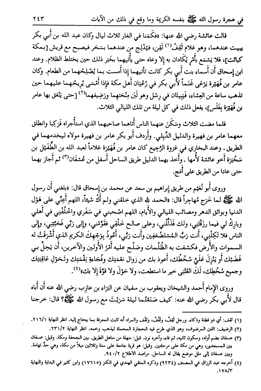 وروى أبو نعيم من طريق إبراهيم بن سعد عن محمد بن إسحاق قال: «بلغني أن رسول الله صلى الله عليه وسلم لما خرج مهاجرا قال: «الحمد لله الذي خلقني ولم أك شيئا، اللهم أعني على هول الدنيا وبوائق الدهر ومصائب الليالي والأيام، اللهم اصحبني في سفري واخلفني في أهلي وبارك لي فيما رزقتني، ولك فذلّلني، وعلى صالح خلقي فقوّمني، وإلى ربّي فحبّبني، وإلى الناس فلا تكلني، أنت ربّ المستضعفين وأنت ربّي، أعوذ بوجهك الكريم الذي أشرقت له السموات والأرض فكشفت به الظلمات وصلح عليه أمر الأولين والآخرين، أن يحلّ بي غضبك أو ينزل عليّ سخطك، أعوذ بك من زوال نعمتك وفجاءة نقمتك وتحوّل عاقبتك وجميع سخطك، لك العتبى خير ما استطعت، ولا حول ولا قوّة إلا بك» [ (4) ] .