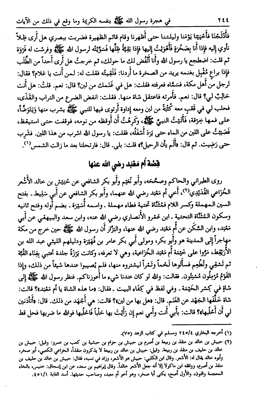 روى الطبراني والحاكم وصححه، وأبو نعيم وأبو بكر الشافعي عن حبيش بن خالد الأشعر الخزاعي القديدي [ (2) ] ، أخي أم معبد رضي الله عنهما، وأبو بكر الشافعي عن أبي سليط- بفتح السين المهملة وكسر اللام فمثناة تحتية فطاء مهملة- واسمه أسيرة- بضم أوله وفتح ثانيه وسكون المثناة التحتية- ابن عمرو الأنصاري رضي الله عنه، وابن سعد والبيهقي عن أبي معبد، وابن السّكن عن أم معبد رضي الله عنها، والبزّار إن رسول الله صلى الله عليه وسلم حين خرج من مكة مهاجرا إلى المدينة هو وأبو بكر، ومولى أبي بكر عامر بن فهيرة ودليلهم الليثي عبد الله بن الأريقط، مروا على خيمة أم معبد الخزاعية، وهي لا تعرفه، وكانت برزة جلدة تحتبي بفناء القبّة ثم تسقي وتطعم فسألوها لحما وتمرا ليشتروه منها، فلم يصيبوا عندها شيئاً من ذلك، وإذا القوم مرملون مسنتون. فقالت: والله لو كان عندنا شيء ما أعوزناكم.