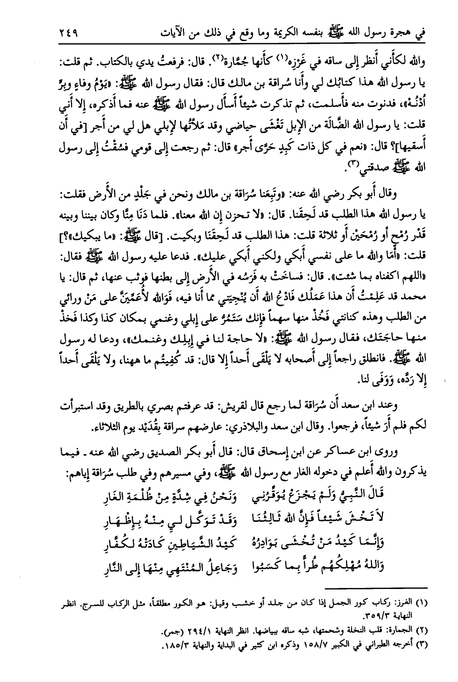 يا رسول الله هذا الطلب قد لحقنا. قال: «لا تحزن إن الله معنا» . فلما دنا منّا وكان بيننا وبينه قدر رمح أو رمحين أو ثلاثة قلت: هذا الطلب قد لحقنا وبكيت. [قال صلى الله عليه وسلم: «ما يبكيك» ؟] قلت: «أما والله ما على نفسي أبكي ولكني أبكي عليك» . فدعا عليه رسول الله صلى الله عليه وسلّم فقال: