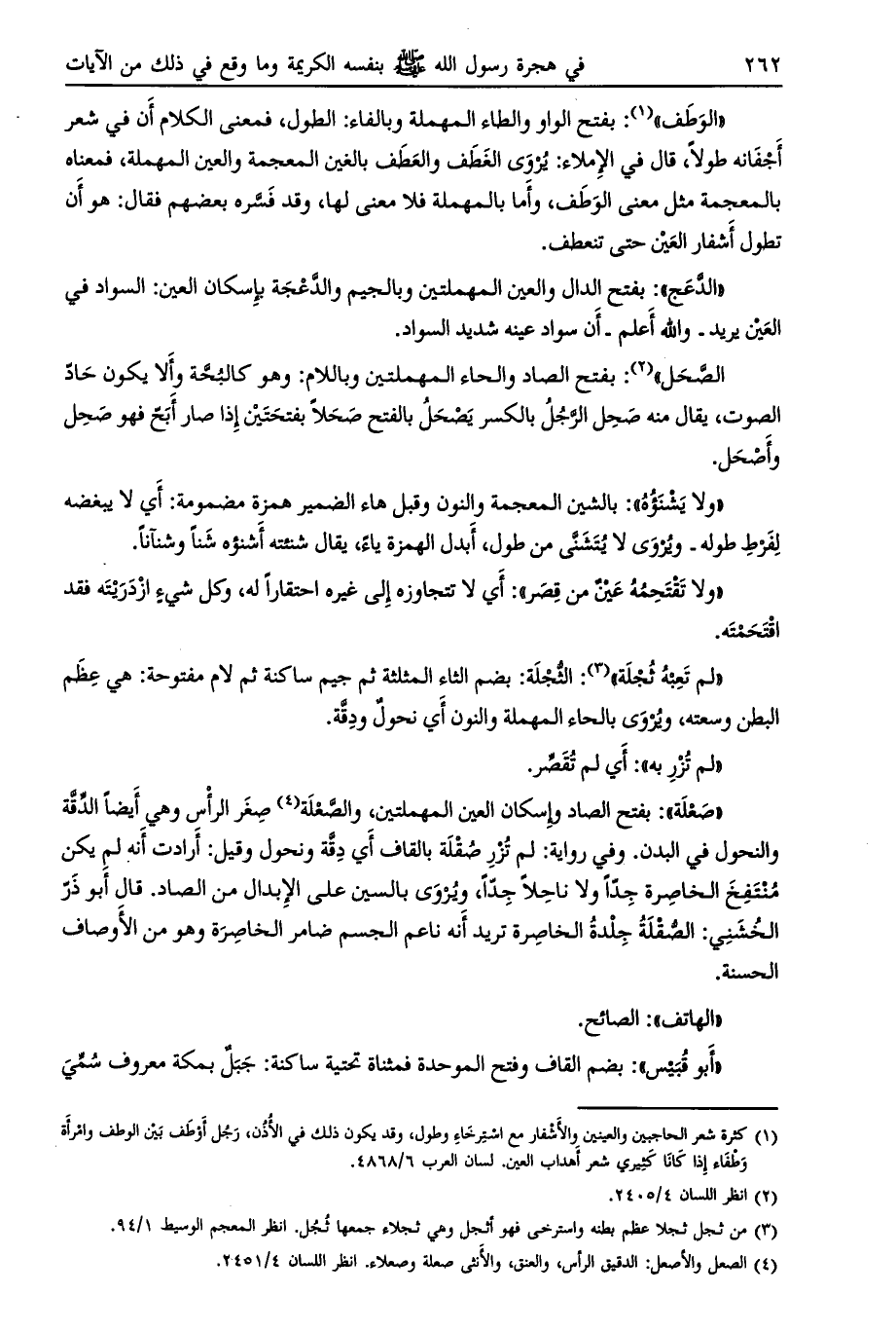 «الوطف» [ (1) ] : بفتح الواو والطاء المهملة وبالفاء: الطول، فمعنى الكلام أن في شعر أجفانه طولا، قال في الإملاء: يروى الغطف والعطف بالغين المعجمة والعين المهملة، فمعناه بالمعجمة مثل معنى الوطف، وأما بالمهملة فلا معنى لها، وقد فسّره بعضهم فقال: هو أن تطول أشفار العين حتى تنعطف.