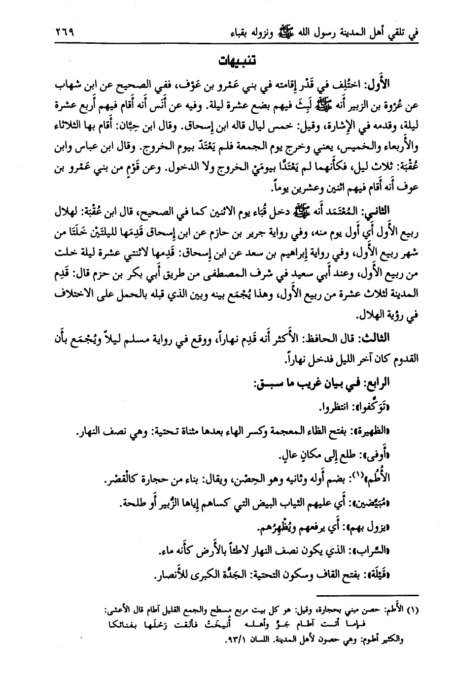 الأول: اختلف في قدر إقامته في بني عمرو بن عوف، ففي الصحيح عن ابن شهاب عن عروة بن الزبير أنه صلى الله عليه وسلّم لبث فيهم بضع عشرة ليلة. وفيه عن أنس أنه أقام فيهم أربع عشرة ليلة، وقدمه في الإشارة، وقيل: خمس ليال قاله ابن إسحاق. وقال ابن حبان: أقام بها الثلاثاء والأربعاء والخميس، يعني وخرج يوم الجمعة فلم يعتدّ بيوم الخروج. وقال ابن عباس وابن عقبة: ثلاث ليل، فكأنهما لم يعتدّا بيومي الخروج ولا الدخول. وعن قوم من بني عمرو بن عوف أنه أقام فيهم اثنين وعشرين يوما.