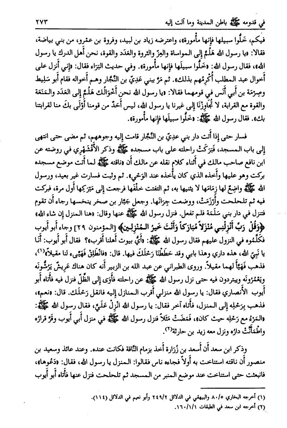 فسار حتى إذا أتت دار بني عدي بن النّجّار قامت إليه وجوههم، ثم مضى حتى انتهى إلي باب المسجد، فبركت راحلته على باب مسجده صلّى الله عليه وسلم وذكر الأقشهري في روضته عن ابن نافع صاحب مالك في أثناء كلام نقله عن مالك أن «ناقته صلى الله عليه وسلم لما أتت موضع مسجده بركت وهو عليها وأخذه الذي كان يأخذه عند الوحي» . ثم وثبت فسارت غير بعيد، ورسول الله صلى الله عليه وسلم واضع لها زمامها لا يثنيها به، ثم التفتت خلفها فرجعت إلى مبركها أول مرة، فبركت فيه ثم تلحلحت وأرزمت، ووضعت جرانها. وجعل جبّار بن صخر ينخسها رجاء أن تقوم فتنزل في دار بني سلمة فلم تفعل. فنزل رسول الله صلى الله عليه وسلم عنها وقال: «هنا المنزل إن شاء الله» وَقُلْ رَبِّ أَنْزِلْنِي مُنْزَلًا مُبارَكاً وَأَنْتَ خَيْرُ الْمُنْزِلِينَ [المؤمنون 29] وجاء أبو أيوب فكلّموه في النزول عليهم فقال رسول الله صلى الله عليه وسلم: «أي بيوت أهلنا أقرب» ؟ فقال أبو أيوب: أنا يا نبي الله، هذه داري وهذا بابي وقد حططنا رحلك فيها. قال: «فانطلق فهيّئ لنا مقيلا» [ (1) ] ، فذهب فهيّأ لهما مقيلا. وروى الطبراني عن عبد الله بن الزبير أنه كان هناك عريش يرشّونه ويعمرونه ويبتردون فيه حتى نزل رسول الله صلى الله عليه وسلم عن راحلته فأوى إلى الظّلّ فنزل فيه فأتاه أبو أيوب الأنصاري فقال: يا رسول الله منزلي أقرب المنازل إليه فانقل رحلك. قال: «نعم» ، فذهب برحله إلى المنزل، فأتاه آخر فقال: يا رسول الله أنزل على، فقال رسول الله صلى الله عليه وسلم: