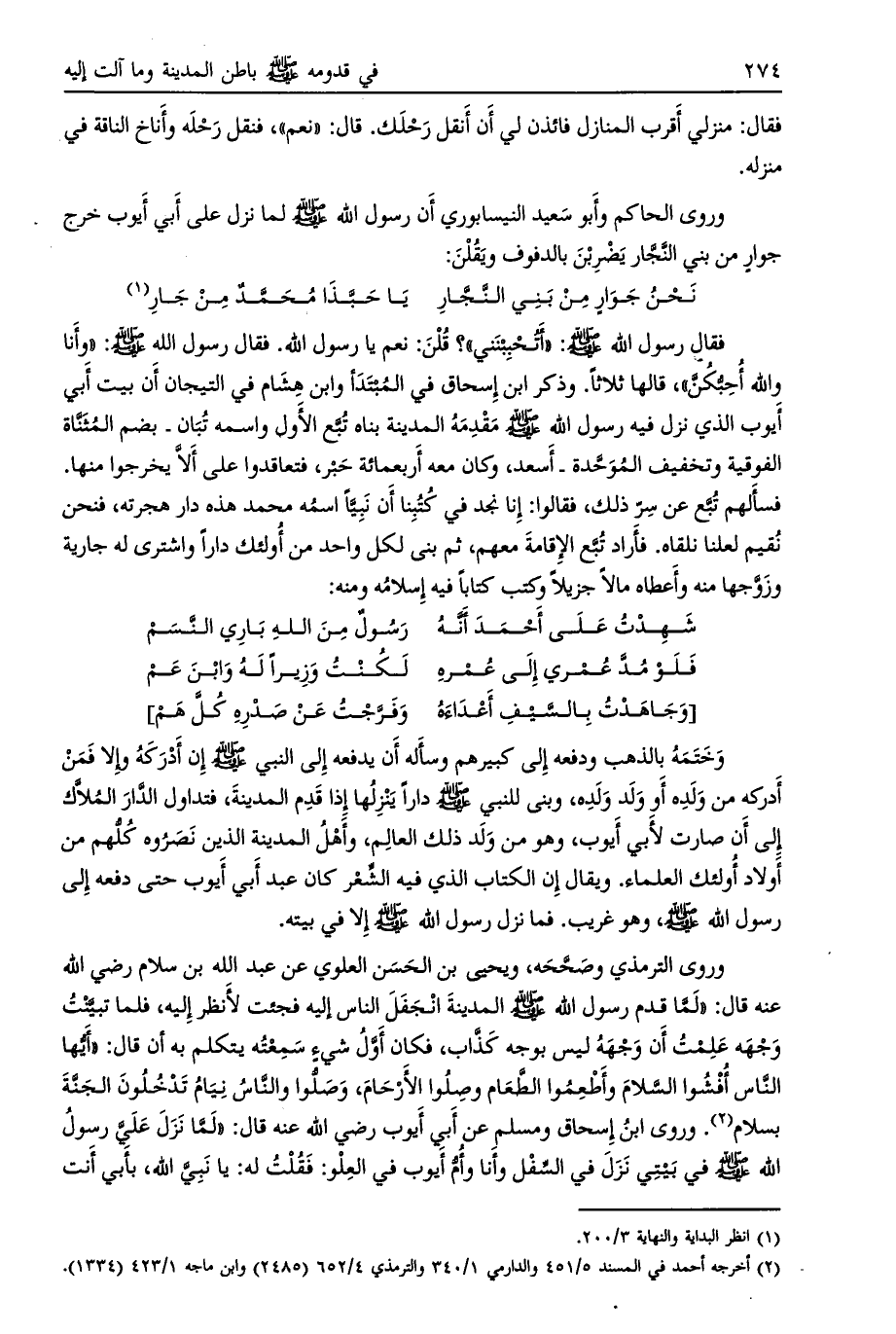 وختمه بالذهب ودفعه إلى كبيرهم وسأله أن يدفعه إلى النبي صلى الله عليه وسلم إن أدركه وإلا فمن أدركه من ولده أو ولد ولده، وبني للنبي صلى الله عليه وسلم دارا ينزلها إذا قدم المدينة، فتداول الدّار الملّاك إلى أن صارت لأبي أيوب، وهو من ولد ذلك العالم، وأهل المدينة الذين نصروه كلّهم من أولاد أولئك العلماء. ويقال إن الكتاب الذي فيه الشّعر كان عبد أبي أيوب حتى دفعه إلى رسول الله صلى الله عليه وسلم، وهو غريب. فما نزل رسول الله صلى الله عليه وسلم إلا في بيته.
