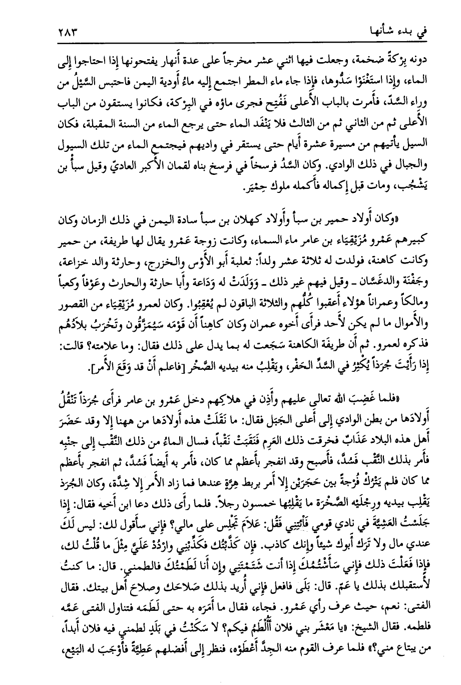 «فلما غضب الله تعالى عليهم وأذن في هلاكهم دخل عمرو بن عامر فرأى جرذا تنقل أولادها من بطن الوادي إلى أعلى الجبل فقال: ما نقلت هذه أولادها من ههنا إلا وقد حضر أهل هذه البلاد عذاب فخرقت ذلك العرم فنقبت نقبا، فسال الماء من ذلك النّقب إلى جنبه فأمر بذلك النّقب فسدّ، فأصبح وقد انفجر بأعظم مما كان، فأمر به أيضا فسدّ، ثم انفجر بأعظم مما كان فلم يترك فرجة بين حجرين إلا أمر بربط هرّة عندها فما زاد الأمر إلا شدّة، وكان الجرذ يقلب بيديه ورجليه الصّخرة ما يقلبها خمسون رجلا. فلما رأى ذلك دعا ابن أخيه فقال: إذا جلست العشيّة في نادي قومي فائتني فقل: علام تجلس على مالي؟ فإني سأقول لك: ليس لك عندي مال ولا ترك أبوك شيئا وإنك كاذب. فإن كذّبتك فكذّبني واردد على مثل ما قلت لك، فإذا فعلت ذلك فإني سأشتمك إذا أنت شتمتني وإن أنا لطمتك فالطمني. قال: ما كنت لأستقبلك بذلك يا عم. قال: بلى فافعل فإني أريد بذلك صلاحك وصلاح أهل بيتك. فقال الفتى: نعم، حيث عرف رأي عمرو. فجاء، فقال ما أمره به حتى لطمه فتناول الفتى عمّه فلطمه. فقال الشيخ: «يا معشر بني فلان أألطم فيكم؟ لا سكنت في بلد لطمني فيه فلان أبدا، من يبتاع مني؟» فلما عرف القوم منه الجدّ أعطوه، فنظر إلى أفضلهم عطيّة فأوجب له البيع،