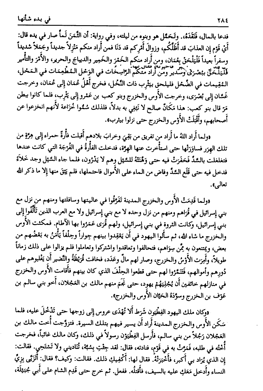 «ولما قدمت الأوس والخزرج المدينة تفرّقوا في عاليتها وسافلتها ومنهم من نزل مع بني إسرائيل في قراهم ومنهم من نزل وحده لا مع بني إسرائيل ولا مع العرب الذين تألّفوا إلى بني إسرائيل، وكانت الثروة في بني إسرائيل، ولهم قرى عمروا بها الآطام. فمكثت الأوس والخزرج ما شاء الله، ثم سألوا اليهود في أن يعقدوا بينهم جوارا وحلفا يأمن به بعضهم من بعض، ويمتنعون به ممّن سواهم، فتحالفوا وتعاقدوا واشتركوا وتعاملوا فلم يزالوا على ذلك زمانا طويلا، وأمرت الأوس والخزرج، وصار لهم مال وعدد، فخافت قريظة والنّضير أن يغلبوهم على دورهم وأموالهم، فتنمّروا لهم حتى قطعوا الحلف الذي كان بينهم فأقامت الأوس والخزرج في منازلهم خائفين أن يجليهم يهود، حتى نجم منهم مالك بن العجلان، أخو بني سالم بن عوف بن الخزرج وسوّده الحيّان الأوس والخزرج» .