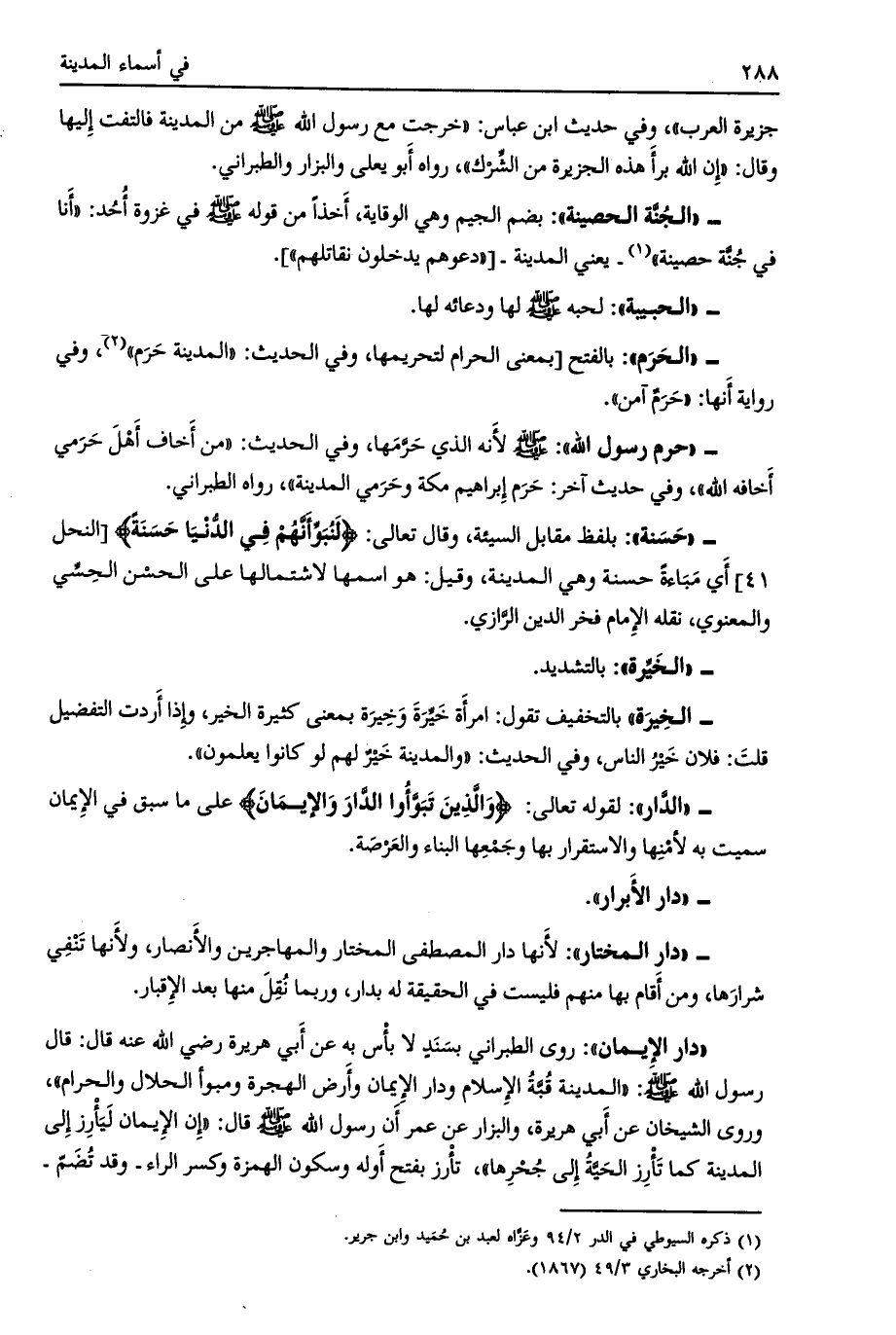 - «الحرم» : بالفتح [بمعنى الحرام لتحريمها، وفي الحديث: «المدينة حرم» [ (2) ] ، وفي رواية أنها: «حرم آمن» .