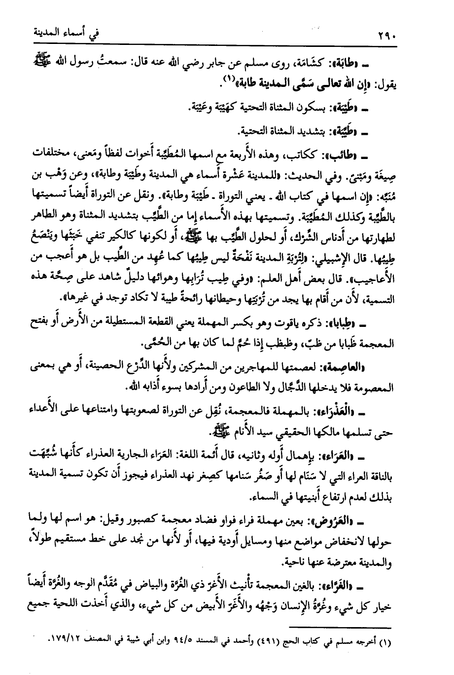 - «طابة» : كشامة، روى مسلم عن جابر رضي الله عنه قال: سمعت رسول الله صلى الله عليه وسلم يقول: «إن الله تعالى سمّى المدينة طابة» [ (1) ] .