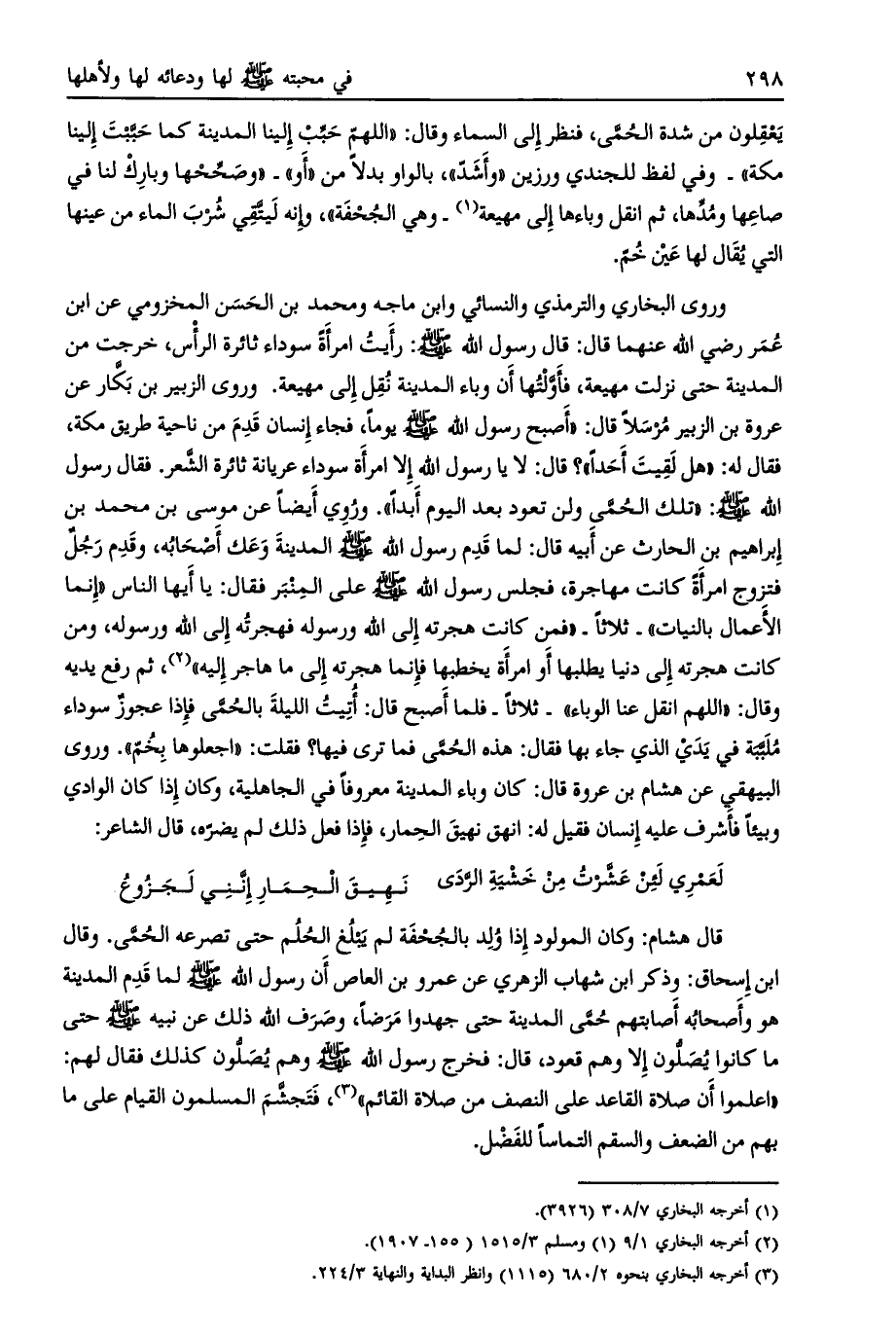 قال هشام: وكان المولود إذا ولد بالجحفة لم يبلغ الحلم حتى تصرعه الحمّى. وقال ابن إسحاق: وذكر ابن شهاب الزهري عن عمرو بن العاص أن رسول الله صلى الله عليه وسلم لما قدم المدينة هو وأصحابه أصابتهم حمّى المدينة حتى جهدوا مرضا، وصرف الله ذلك عن نبيه صلى الله عليه وسلم حتى ما كانوا يصلون إلا وهم قعود، قال: