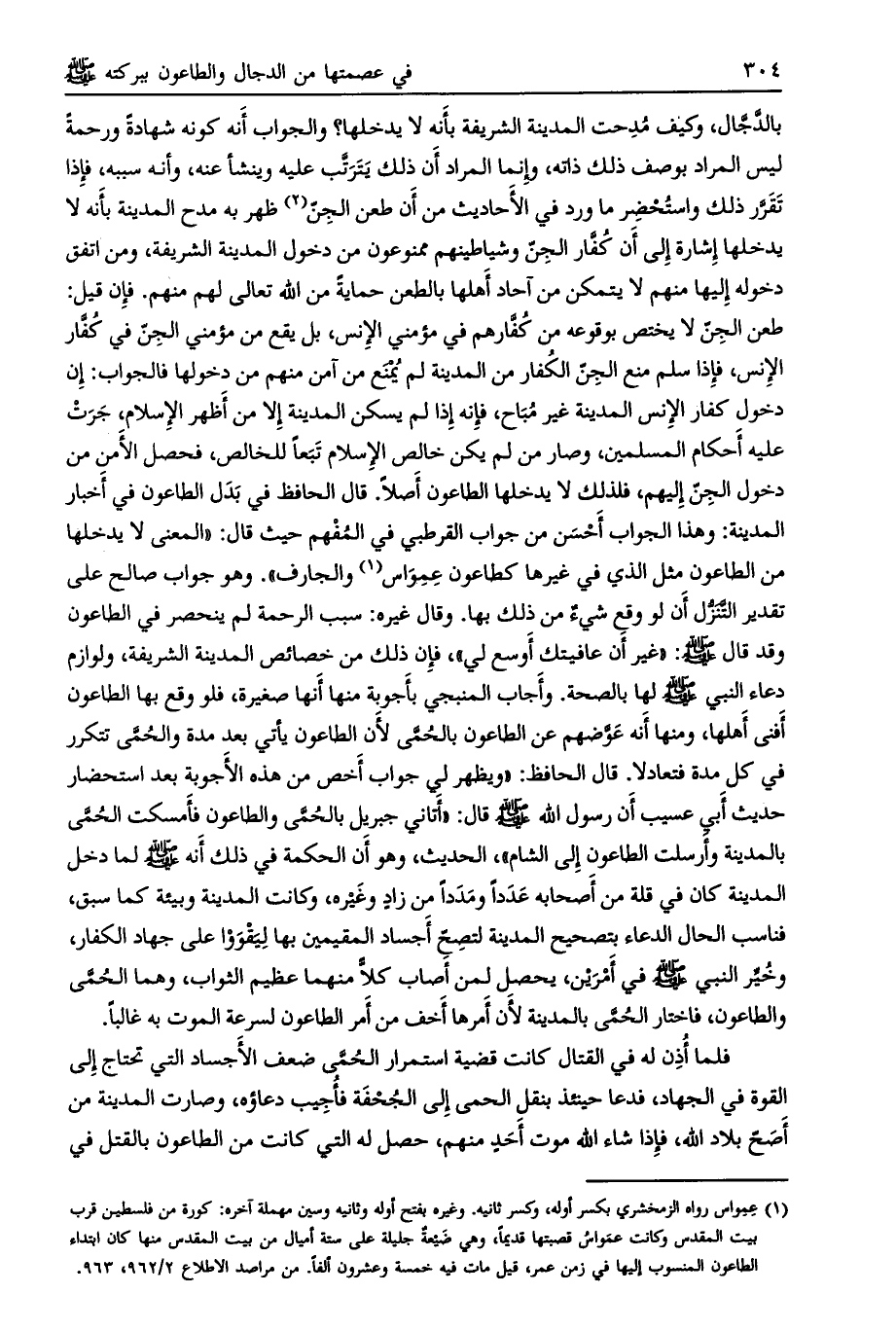فإن ذلك من خصائص المدينة الشريفة، ولوازم دعاء النبي صلى الله عليه وسلم لها بالصحة. وأجاب المنبجي بأجوبة منها أنها صغيرة، فلو وقع بها الطاعون أفنى أهلها، ومنها أنه عوّضهم عن الطاعون بالحمّى لأن الطاعون يأتي بعد مدة والحمى تتكرر في كل مدة فتعادلا. قال الحافظ: «ويظهر لي جواب أخص من هذه الأجوبة بعد استحضار