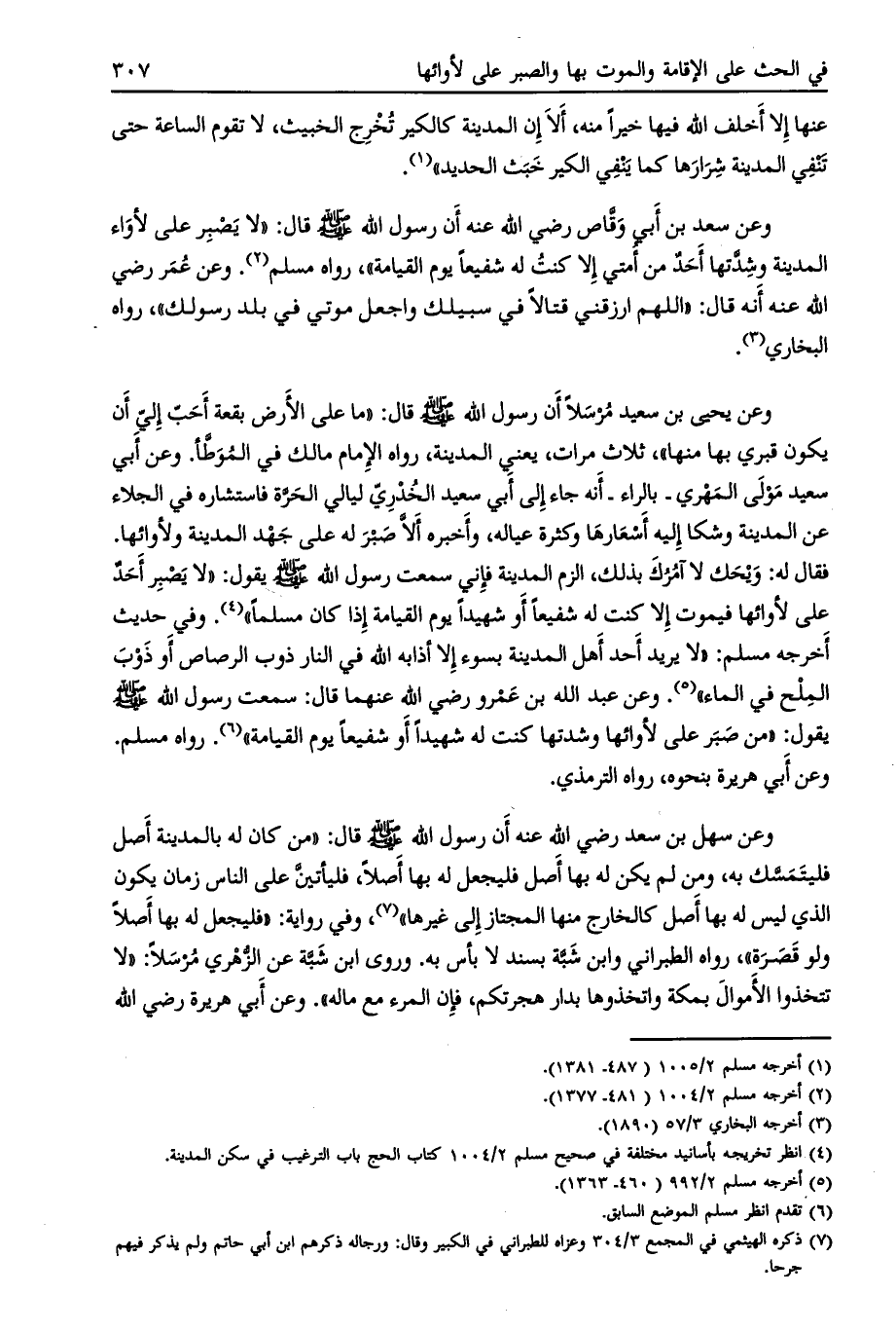 [ (4) ] انظر تخريجه بأسانيد مختلفة في صحيح مسلم 2/ 1004 كتاب الحج باب الترغيب في سكن المدينة.