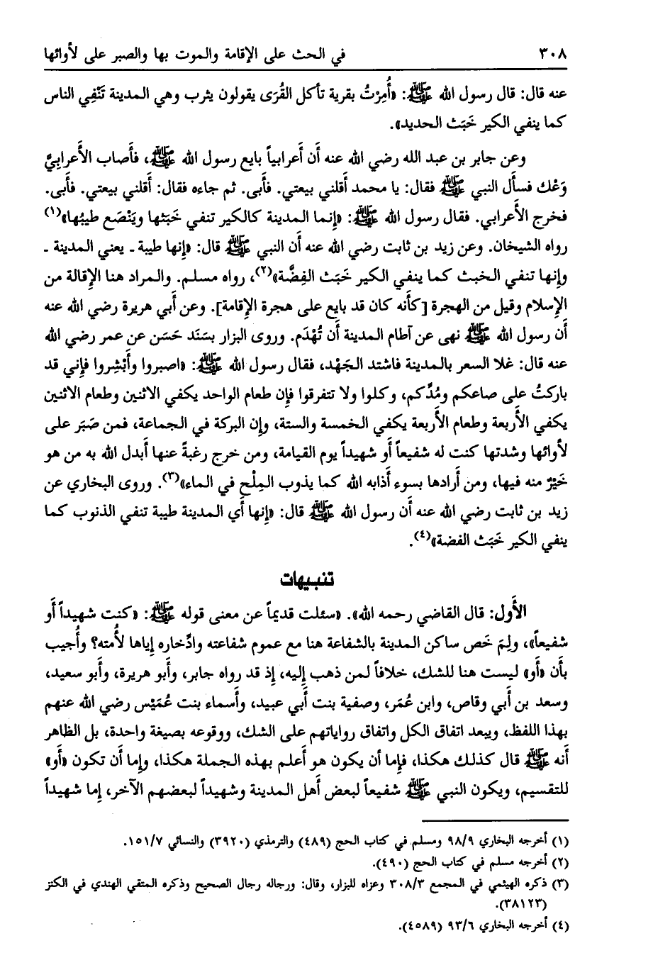 فخرج الأعرابي. فقال رسول الله صلى الله عليه وسلم: «إنما المدينة كالكير تنفي خبثها وينصع طيبها» [ (1) ] رواه الشيخان.
