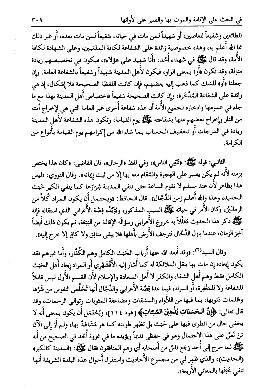 وقال السيد: «وقد أبعد الله عنها أرباب الخبث الكامل وهم الكفّار، وأما غيرهم فقد يكون إبعاده إن مات بها بنقل الملائكة له كما أشار إليه الأقشهري أو المراد إبعاد أهل الخبث الكامل فقط وهم أهل الشقاء والكفر لا أهل السعادة والإسلام لأن القسم الأول ليس قابلا للشفاعة ولا للمغفرة، أو المراد فيما عدا قصّة الأعرابي والدّجّال أنها تخلّص النفوس من شرّها وظلمات ذنوبها، بما فيها من اللأواء والمشقات ومضاعفة المثوبات وتوالي الرحمات، وقد قال تعالى: إِنَّ الْحَسَناتِ يُذْهِبْنَ السَّيِّئاتِ [هود 114] ، ويحتمل أن يكون بمعنى أنه لا يخفى حال من انطوى فيها على خبث بل تظهر طويته كما هو مشاهد بها، ولم أر إلى الآن من نصّ على هذا الاحتمال وهو في حفظي قديما ويؤيده ما في غزوة أحد في الصحيح من أنه صلى الله عليه وسلم لما خرج إلى أحد رجع ناس من أصحابه أي وهم المنافقون