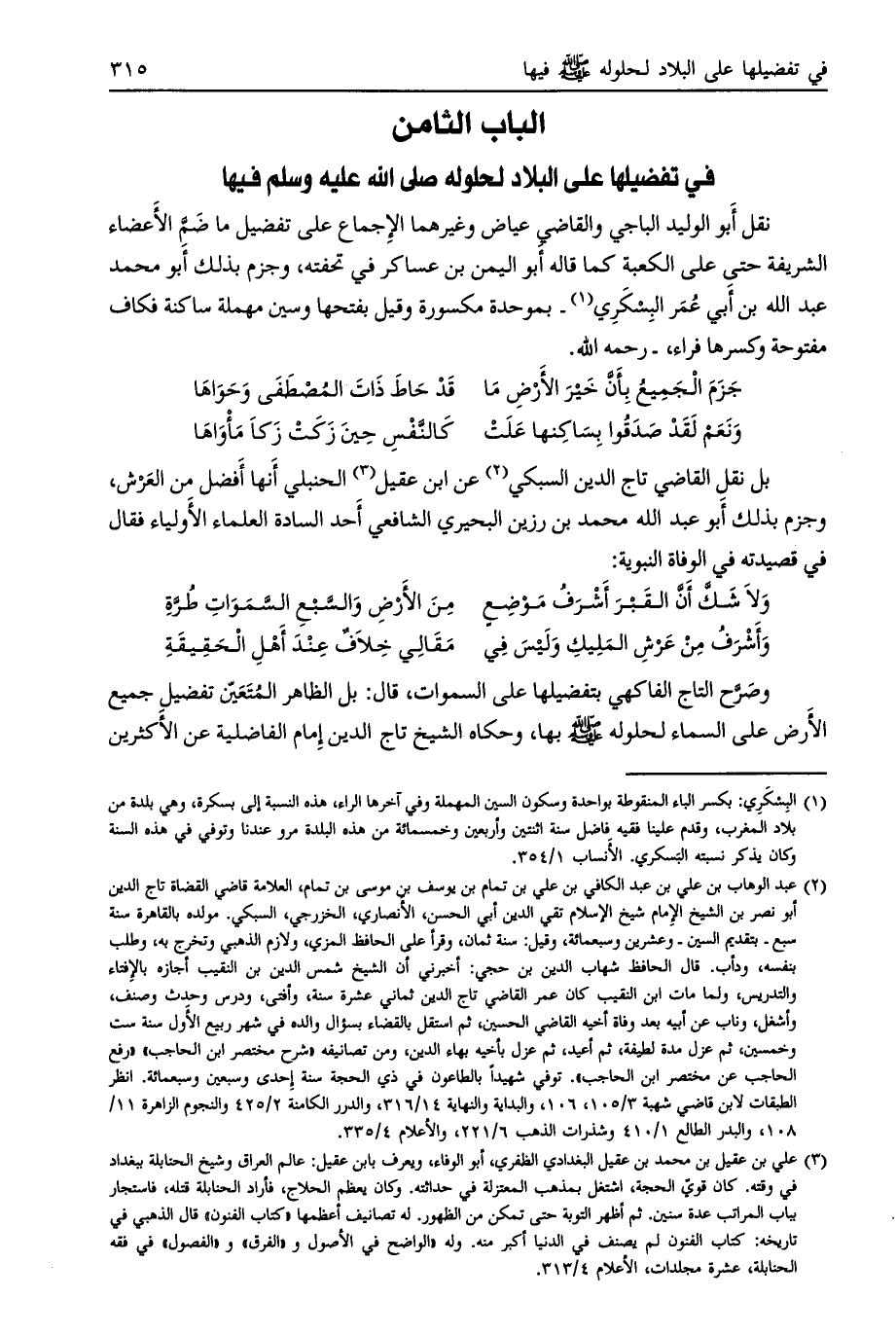 نقل أبو الوليد الباجي والقاضي عياض وغيرهما الإجماع على تفضيل ما ضمّ الأعضاء الشريفة حتى على الكعبة كما قاله أبو اليمن بن عساكر في تحفته، وجزم بذلك أبو محمد عبد الله بن أبي عمر البسكري [ (1) ]- بموحدة مكسورة وقيل بفتحها وسين مهملة ساكنة فكاف مفتوحة وكسرها فراء، - رحمه الله.