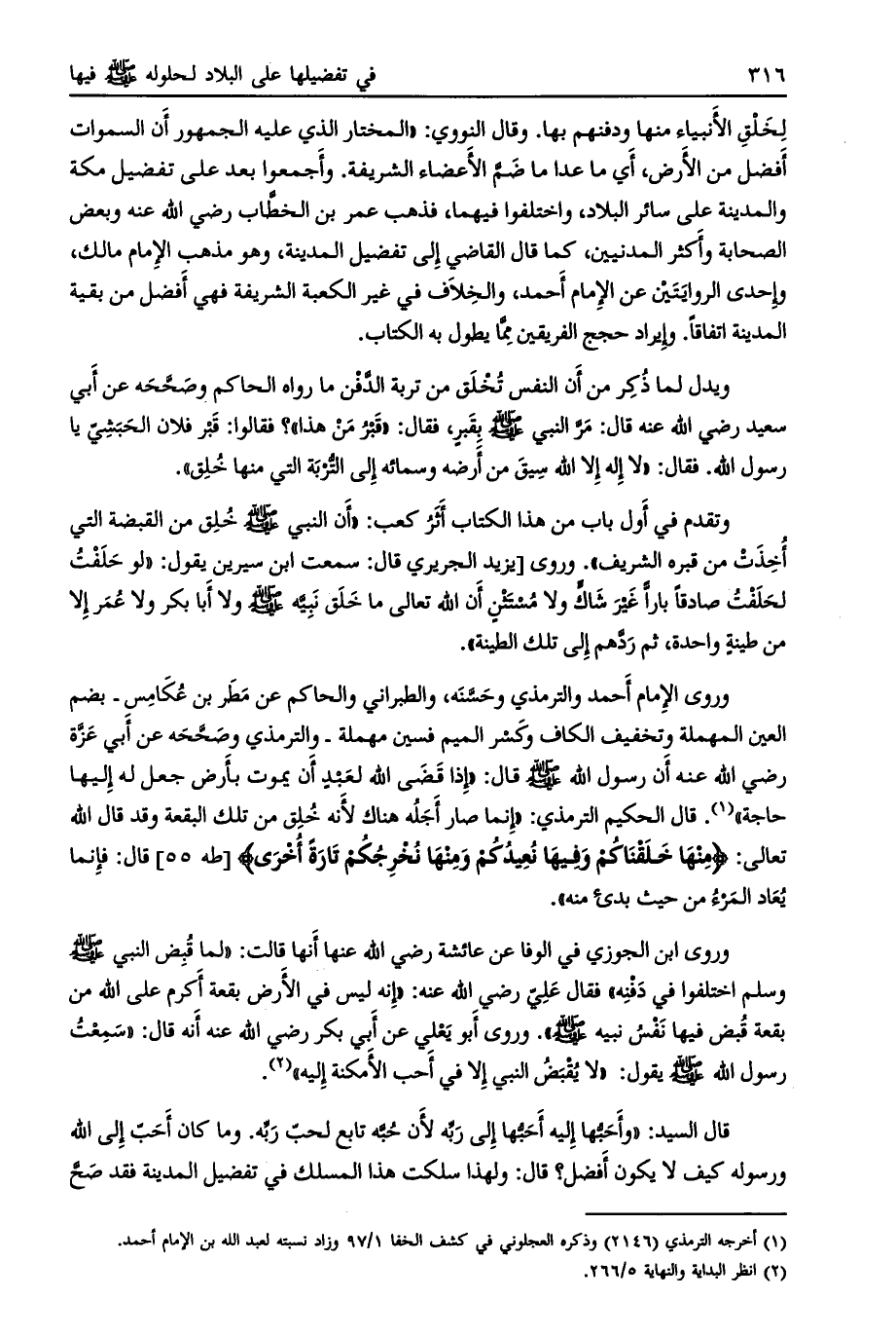 لخلق الأنبياء منها ودفنهم بها. وقال النووي: «المختار الذي عليه الجمهور أن السموات أفضل من الأرض، أي ما عدا ما ضمّ الأعضاء الشريفة. وأجمعوا بعد على تفضيل مكة والمدينة على سائر البلاد، واختلفوا فيهما، فذهب عمر بن الخطاب رضي الله عنه وبعض الصحابة وأكثر المدنيين، كما قال القاضي إلى تفضيل المدينة، وهو مذهب الإمام مالك، وإحدى الروايتين عن الإمام أحمد، والخلاف في غير الكعبة الشريفة فهي أفضل من بقية المدينة اتفاقا. وإيراد حجج الفريقين ممّا يطول به الكتاب.