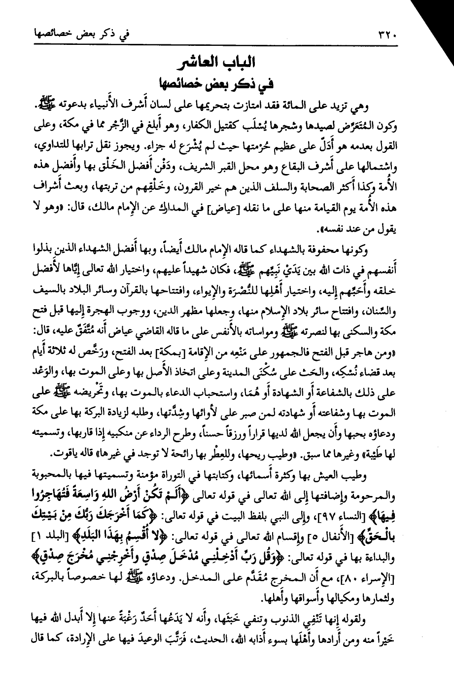 وطيب العيش بها وكثرة أسمائها، وكتابتها في التوراة مؤمنة وتسميتها فيها بالمحبوبة والمرحومة وإضافتها إلى الله تعالى في قوله تعالى أَلَمْ تَكُنْ أَرْضُ اللَّهِ واسِعَةً فَتُهاجِرُوا فِيها [النساء 97] ، وإلى النبي بلفظ البيت في قوله تعالى: كَما أَخْرَجَكَ رَبُّكَ مِنْ بَيْتِكَ بِالْحَقِّ [الأنفال 5] وإقسام الله تعالى في قوله تعالى: لا أُقْسِمُ بِهذَا الْبَلَدِ [البلد 1] والبداءة بها في قوله تعالى: وَقُلْ رَبِّ أَدْخِلْنِي مُدْخَلَ صِدْقٍ وَأَخْرِجْنِي مُخْرَجَ صِدْقٍ [الإسراء 80] ، مع أن المخرج مقدّم على المدخل. ودعاؤه صلى الله عليه وسلم لها خصوصا بالبركة، ولثمارها ومكيالها وأسواقها وأهلها.