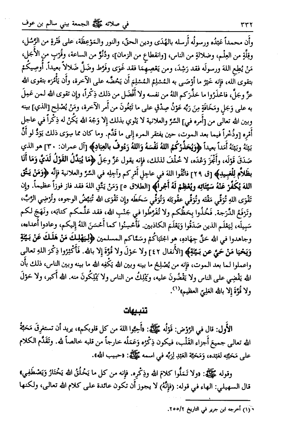 وأن محمدا عبده ورسوله أرسله بالهدى ودين الحق، والنور والموعظة، على فترة من الرسل، وقلة من العلم، وضلالة من الناس، [وانقطاع من الزمان] ، ودنو من الساعة، وقرب من الأجل، من يطع الله ورسوله فقد رشد، ومن يعصهما فقد غوى وفرط وضل ضلالا بعيدا. أوصيكم بتقوى الله، فإنه خير ما أوصى به المسلم المسلم أن يحضه على الآخرة، وأن يأمره بتقوى الله عز وجل، فاحذروا ما حذركم الله من نفسه ولا أفضل من ذلك ذكرا، وإن تقوى الله لمن عمل به على وجل ومخافة من ربّه عون صدق على ما تبغون من أمر الآخرة، ومن يصلح [الذي] بينه وبين الله تعالى من [أمره في] السر والعلانية لا ينوي بذلك إلا وجه الله يكن له ذكرا في عاجل أمره [وذخرا فيما بعد الموت، حين يفتقر المرء إلى ما قدم. وما كان مما سوى ذلك يودّ لو أنّ بينه وبينه أمدا بعيدا وَيُحَذِّرُكُمُ اللَّهُ نَفْسَهُ وَاللَّهُ رَؤُفٌ بِالْعِبادِ [آل عمران: 30] هو الذي صدق قوله، وأنجز وعده، لا خلف لذلك، فإنه يقول عز وجل ما يُبَدَّلُ الْقَوْلُ لَدَيَّ وَما أَنَا بِظَلَّامٍ لِلْعَبِيدِ [ق 29] فاتقوا الله في عاجل أمركم وآجله في السر والعلانية فإنّه وَمَنْ يَتَّقِ اللَّهَ يُكَفِّرْ عَنْهُ سَيِّئاتِهِ وَيُعْظِمْ لَهُ أَجْراً [الطلاق 5] ومن يتّق الله فقد فاز فوزا عظيما. وإن تقوى الله توقي مقته وتوقي عقوبته وتوقي سخطه وإن تقوى الله تبيّض الوجوه، وترضي الرب، وترفع الدّرجة. فخذوا بحظكم ولا تفرطوا في جنب الله، فقد علّمكم كتابه، ونهج لكم سبيله، ليعلم الذين صدقوا ويعلم الكاذبين. فأحسنوا كما أحسن الله إليكم، وعادوا أعداءه، وجاهدوا في الله حق جهاده، هو اجتباكم وسماكم المسلمين لِيَهْلِكَ مَنْ هَلَكَ عَنْ بَيِّنَةٍ وَيَحْيى مَنْ حَيَّ عَنْ بَيِّنَةٍ [الأنفال 42] ولا حول ولا قوة إلا بالله. فأكثروا ذكر الله تعالى واعملوا لما بعد الموت، فإنه من يصلح ما بينه وبين الله يكفه الله ما بينه وبين الناس، ذلك بأن الله يقضي على الناس ولا يقضون عليه، ويملك من الناس ولا يملكون منه. الله أكبر، ولا حول ولا قوة إلا بالله العلي العظيم» [ (1) ] .