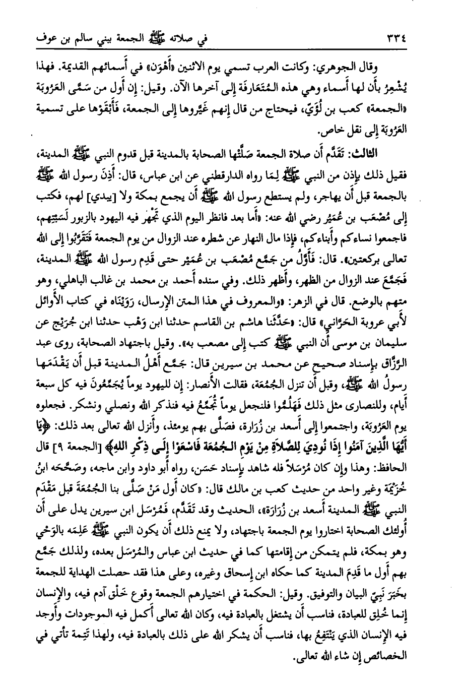 فكتب إلى مصعب بن عمير رضي الله عنه: «أما بعد فانظر اليوم الذي تجهر فيه اليهود بالزبور لسبتهم، فاجمعوا نساءكم وأبناءكم، فإذا مال النهار عن شطره عند الزوال من يوم الجمعة فتقربوا إلى الله تعالى بركعتين» .