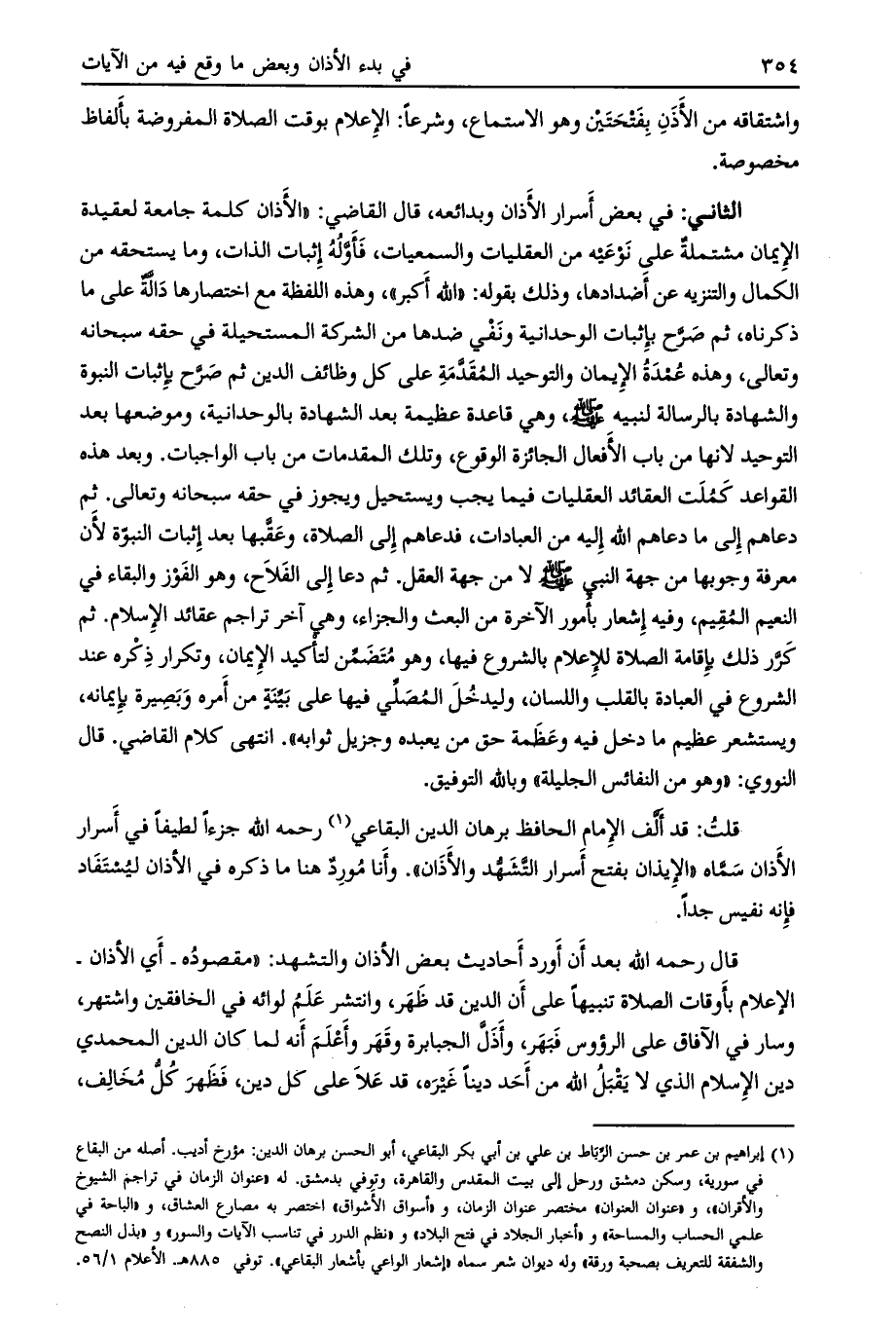 قلت: قد ألّف الإمام الحافظ برهان الدين البقاعي [ (1) ] رحمه الله جزءا لطيفا في أسرار الأذان سمّاه «الإيذان بفتح أسرار التشهّد والأذان» . وأنا مورد هنا ما ذكره في الأذان ليستفاد فإنه نفيس جداً.