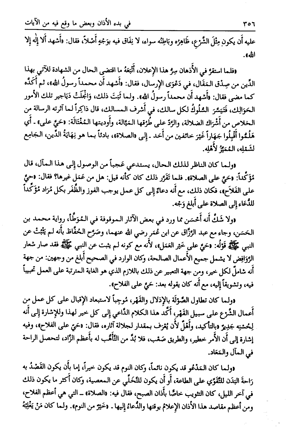 «فلما استقرّ في الأذهان سرّ هذا الإعلان، أتبعه ما اقتضى الحال من الشهادة للآتي بهذا الدّين من صدق المقال، في دعوى الإرسال، فقال: «أشهد أن محمدا رسول الله» ، ثم أكدّه كما مضى فقال: «أشهد أن محمدا رسول الله» . ولما ثبت ذلك، وانجلت دياجير تلك الأمور الحوالك، فتيسّر السّلوك لكل سالك، في أشرف المسالك، قال ذاكرا لما آثرته الرسالة من الخلاص من أشراك الضلالة، والرّدّ على طرقها الميّالة، وأوديتها المغتالة: «حيّ على» - أي هلمّوا أقبلوا جهارا غير خائفين من أحد- إلى «الصلاة» ، بادئا بما هو نهاية الدّين، الجامع لشمله، المميّز لأهله.