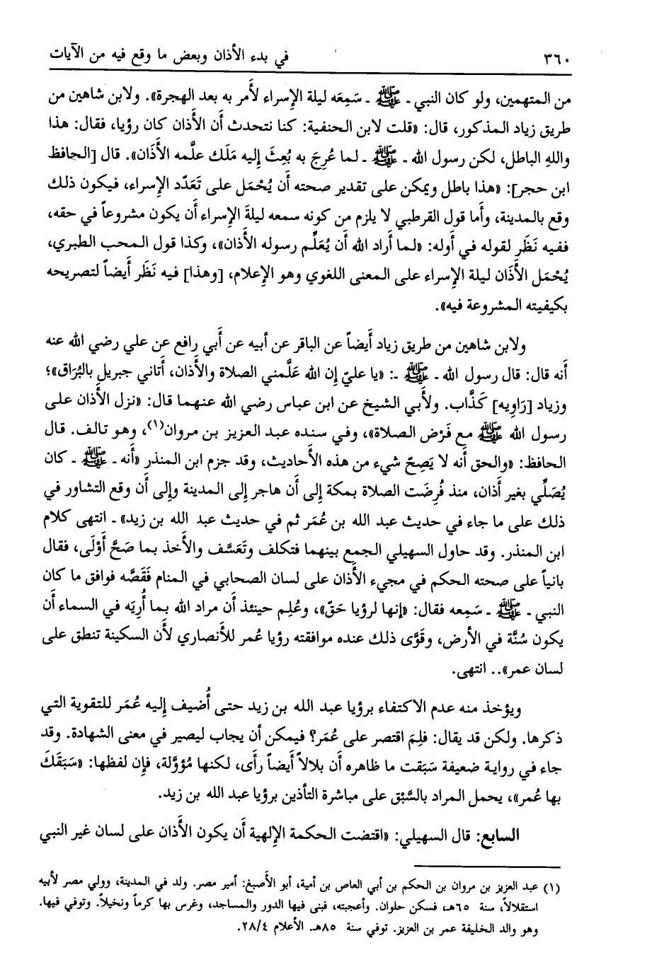 من المتهمين، ولو كان النبي- صلى الله عليه وسلم- سمعه ليلة الإسراء لأمر به بعد الهجرة» . ولابن شاهين من طريق زياد المذكور، قال: «قلت لابن الحنفية: كنا نتحدث أن الأذان كان رؤيا، فقال: هذا والله الباطل، لكن رسول الله- صلى الله عليه وسلم- لما عرج به بعث إليه ملك علّمه الأذان» . قال [الحافظ ابن حجر] : «هذا باطل ويمكن على تقدير صحته أن يحمل على تعدّد الإسراء، فيكون ذلك وقع بالمدينة، وأما قول القرطبي لا يلزم من كونه سمعه ليلة الإسراء إن يكون مشروعا في حقه، ففيه نظر لقوله في أوله: «لما أراد الله أن يعلم رسوله الأذان» ، وكذا قول المحب الطبري، يحمل الأذان ليلة الإسراء على المعنى اللغوي وهو الإعلام، [وهذا] فيه نظر أيضا لتصريحه بكيفيته المشروعة فيه» .