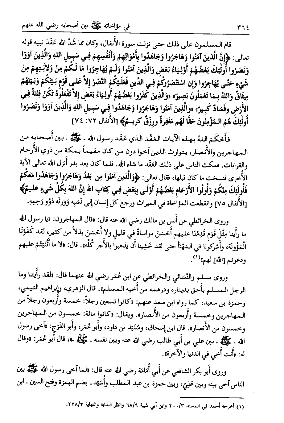 وَالَّذِينَ كَفَرُوا بَعْضُهُمْ أَوْلِياءُ بَعْضٍ إِلَّا تَفْعَلُوهُ تَكُنْ فِتْنَةٌ فِي الْأَرْضِ وَفَسادٌ كَبِيرٌ وَالَّذِينَ آمَنُوا وَهاجَرُوا وَجاهَدُوا فِي سَبِيلِ اللَّهِ وَالَّذِينَ آوَوْا وَنَصَرُوا أُولئِكَ هُمُ الْمُؤْمِنُونَ حَقًّا لَهُمْ مَغْفِرَةٌ وَرِزْقٌ كَرِيمٌ [الأنفال 72: 74] فأحكم الله بهذه الآيات العقد الذي عقد رسول الله- صلى الله عليه وسلم- بين أصحابه من المهاجرين والأنصار، يتوارث الذين آخوا دون من كان مقيما بمكة من ذوي الأرحام والقرابات. فمكث الناس على ذلك العقد ما شاء الله. فلما كان بعد بدر أنزل الله تعالى الآية الأخرى فنسخت ما كان قبلها، فقال تعالى: وَالَّذِينَ آمَنُوا مِنْ بَعْدُ وَهاجَرُوا وَجاهَدُوا مَعَكُمْ فَأُولئِكَ مِنْكُمْ وَأُولُوا الْأَرْحامِ بَعْضُهُمْ أَوْلى بِبَعْضٍ فِي كِتابِ اللَّهِ إِنَّ اللَّهَ بِكُلِّ شَيْءٍ عَلِيمٌ [الأنفال 75] وانقطعت المؤاخاة في الميراث ورجع كل إنسان إلى نسبه وورثه ذوو رحمه.