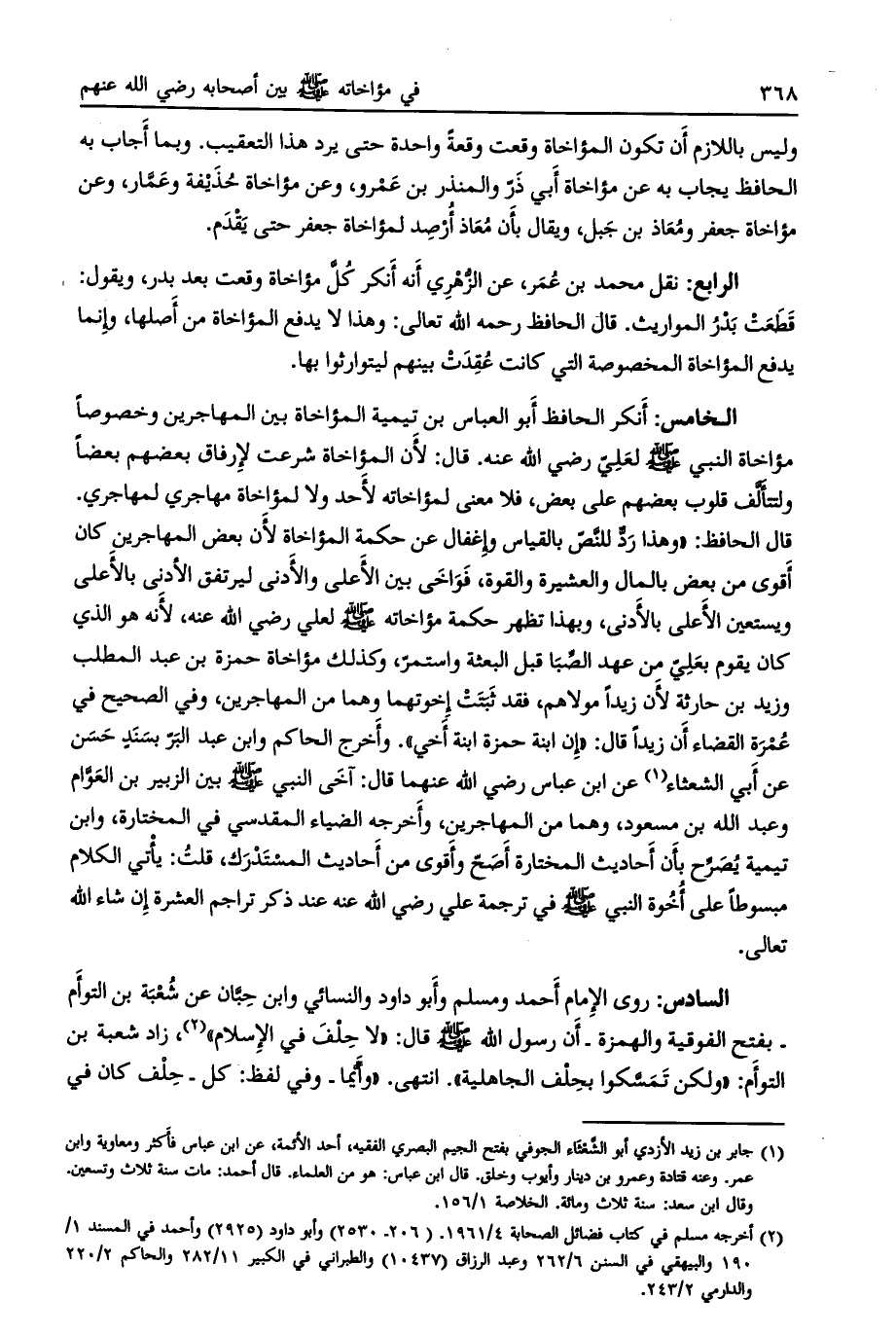 قال الحافظ: «وهذا ردّ للنّصّ بالقياس وإغفال عن حكمة المؤاخاة لأن بعض المهاجرين كان أقوى من بعض بالمال والعشيرة والقوة، فواخى بين الأعلى والأدنى ليرتفق الأدنى بالأعلى ويستعين الأعلى بالأدنى، وبهذا تظهر حكمة مؤاخاته صلى الله عليه وسلم لعلي رضي الله عنه، لأنه هو الذي كان يقوم بعليّ من عهد الصّبا قبل البعثة واستمرّ، وكذلك مؤاخاة حمزة بن عبد المطلب وزيد بن حارثة لأن زيدا مولاهم، فقد ثبتت إخوتهما وهما من المهاجرين، وفي الصحيح في عمرة القضاء أن زيدا قال: «إن ابنة حمزة ابنة أخي» . وأخرج الحاكم وابن عبد البر بسند حسن عن أبي الشعثاء [ (1) ] عن ابن عباس رضي الله عنهما قال: آخى النبي صلى الله عليه وسلم بين الزبير بن العوام وعبد الله بن مسعود، وهما من المهاجرين، وأخرجه الضياء المقدسي في المختارة، وابن تيمية يصرّح بأن أحاديث المختارة أصحّ وأقوى من أحاديث المستدرك، قلت: يأتي الكلام مبسوطا على أخوة النبي صلى الله عليه وسلم في ترجمة علي رضي الله عنه عند ذكر تراجم العشرة إن شاء الله تعالى.