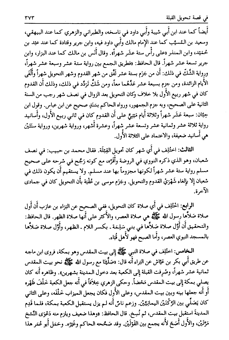 أيضا كما عند ابن أبي شيبة وأبي داود في ناسخه، والطبراني والزهري كما عند البيهقي، وسعيد بن المسيب كما عند الإمام مالك وأبي داود فيه، وابن جرير وقتادة كما عند عبد بن حميد، وابن المنذر «على رأس ستة عشر شهراً» . وقال أنس بن مالك كما عند البزار، وابن جرير تسعة عشر شهراً. قال الحافظ: «فطريق الجمع بين رواية ستة عشر وسبعة عشر شهرا، ورواية الشك في ذلك: أن من جزم بستة عشر لفق من شهر القدوم وشهر التحويل وشهرا وألغى الأيام الزائدة، ومن جزم بسبعة عشر عدهما معا، ومن شك تردد في ذلك، وذلك أن القدوم كان في شهر ربيع الأول بلا خلاف وكان التحويل بعد الزوال في نصف شهر رجب من السنة الثانية على الصحيح، وبه جزم الجمهور، ورواه الحاكم بسند صحيح عن ابن عباس. وقول ابن حبّان: سبعة عشر شهرا وثلاثة أيام مبني على أن القدوم كان في ثاني ربيع الأول، وأسانيد رواية ثلاثة عشر وثمانية عشر وتسعة عشر شهرا، وعشرة أشهر، ورواية شهرين، ورواية سنتين هي أسانيد ضعيفة، والاعتماد على الثلاثة الأول.