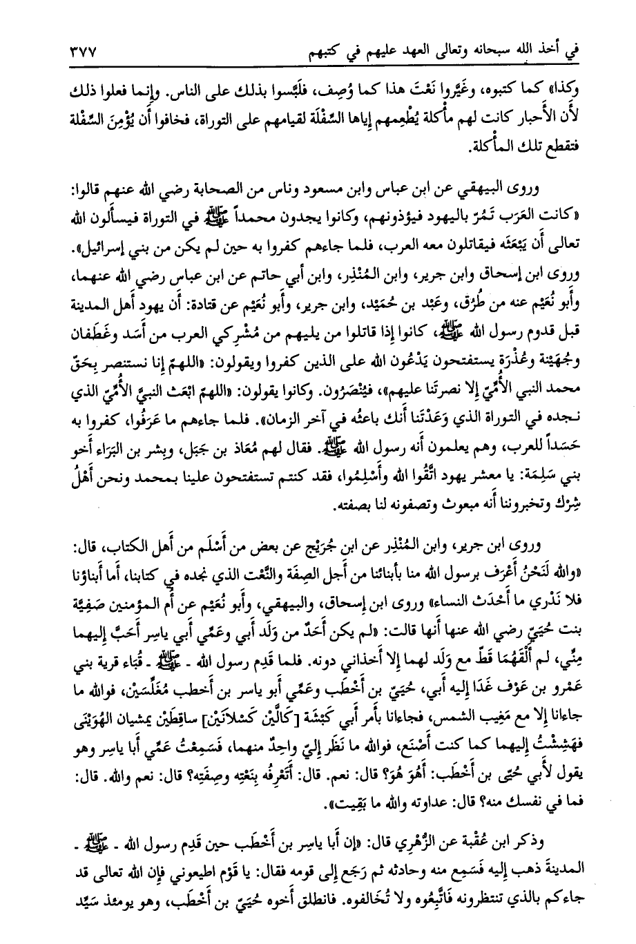 «والله لنحن أعرف برسول الله منا بأبنائنا من أجل الصفة والنّعت الذي نجده في كتابنا، أما أبناؤنا فلا ندري ما أحدث النساء» وروى ابن إسحاق، والبيهقي، وأبو نعيم عن أم المؤمنين صفية بنت حيي رضي الله عنها أنها قالت: «لم يكن أحد من ولد أبي وعمّي أبي ياسر أحبّ إليهما منّي، لم ألقهما قطّ مع ولد لهما إلا أخذاني دونه. فلما قدم رسول الله- صلى الله عليه وسلم- قباء قرية بني عمرو بن عوف غدا إليه أبي، حيي بن اخطب وعمّي أبو ياسر بن أخطب مغلّسين، فو الله ما جاءانا إلا مع مغيب الشمس، فجاءانا بأمر أبي كبشة [كالّين كسلانين] ساقطين يمشيان الهوينى فهششت إليهما كما كنت أصنع، فوالله ما نظر إلى واحد منهما، فسمعت عمّي أبا ياسر وهو يقول لأبي حيي بن اخطب: أهو هو؟ قال: نعم. قال: أتعرفه بنعته وصفته؟ قال: نعم والله. قال: