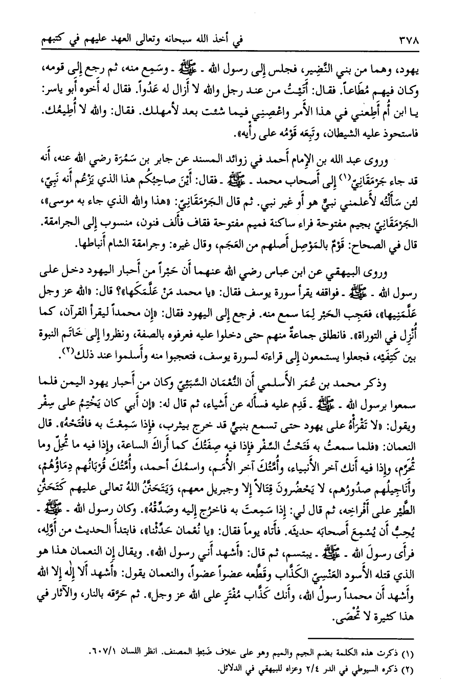 وروى عبد الله بن الإمام أحمد في زوائد المسند عن جابر بن سمرة رضي الله عنه، أنه قد جاء جرمقانيّ [ (1) ] إلى أصحاب محمد- صلى الله عليه وسلم- فقال: أين صاحبكم هذا الذي يزعم أنه نبيّ، لئن سألته لأعلمني نبيّ هو أو غير نبي. ثم قال الجرمقانيّ: «هذا والله الذي جاء به موسى» ، الجرمقانيّ بجيم مفتوحة فراء ساكنة فميم مفتوحة فقاف فألف فنون، منسوب إلى الجرامقة.