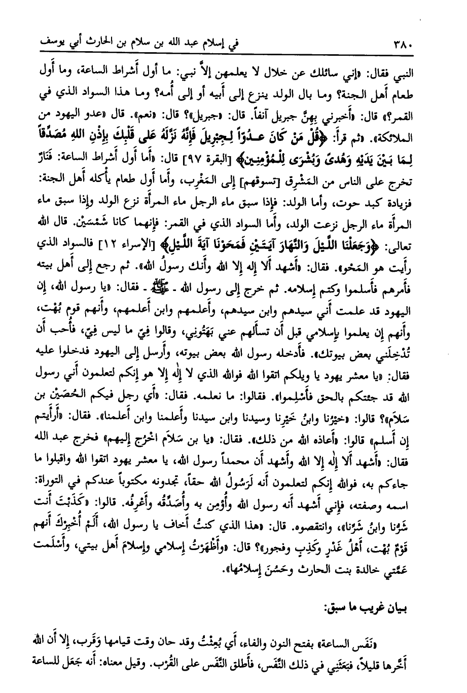 فزيادة كبد حوت، وأما الولد: فإذا سبق ماء الرجل ماء المرأة نزع الولد وإذا سبق ماء المرأة ماء الرجل نزعت الولد، وأما السواد الذي في القمر: فإنهما كانا شمسين. قال الله تعالى: وَجَعَلْنَا اللَّيْلَ وَالنَّهارَ آيَتَيْنِ فَمَحَوْنا آيَةَ اللَّيْلِ [الإسراء 12] فالسواد الذي رأيت هو المحو» . فقال: «أشهد ألا إله إلا الله وأنك رسول الله» . ثم رجع إلى أهل بيته فأمرهم فأسلموا وكتم إسلامه. ثم خرج إلى رسول الله- صلى الله عليه وسلم- فقال: «يا رسول الله، إن اليهود قد علمت أني سيدهم وابن سيدهم، وأعلمهم وابن أعلمهم، وأنهم قوم بهت، وأنهم إن يعلموا بإسلامي قبل أن تسألهم عني بهتوني، وقالوا فيّ ما ليس في، فأحب أن تدخلني بعض بيوتك» . فأدخله رسول الله بعض بيوته، وأرسل إلى اليهود فدخلوا عليه فقال: «يا معشر يهود يا ويلكم اتقوا الله فو الله الذي لا إله إلا هو إنكم لتعلمون إني رسول الله قد جئتكم بالحق فأسلموا» . فقالوا: ما نعلمه. فقال: «أي رجل فيكم الحصين بن سلام» ؟ قالوا: «خيرنا وابن خيرنا وسيدنا وابن سيدنا وأعلمنا وابن أعلمنا» . فقال: «أرأيتم إن أسلم» قالوا: «أعاذه الله من ذلك» . فقال: «يا بن سلام اخرج إليهم»